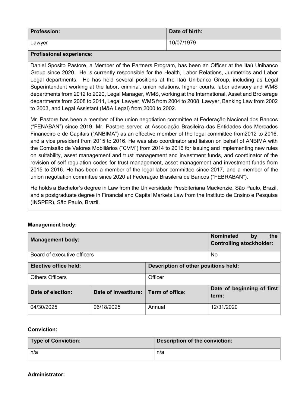 Profession: Date of birth: Lawyer 10/07/1979 Profissional experience: Daniel Sposito Pastore, a Member of the Partners Program, has been an Officer at the Itaú Unibanco Group since 2020. He is currently responsible for the Health, Labor Relations, Jurimetrics and Labor Legal departments. He has held several positions at the Itaú Unibanco Group, including as Legal Superintendent working at the labor, criminal, union relations, higher courts, labor advisory and WMS departments from 2012 to 2020, Legal Manager, WMS, working at the International, Asset and Brokerage departments from 2008 to 2011, Legal Lawyer, WMS from 2004 to 2008, Lawyer, Banking Law from 2002 to 2003, and Legal Assistant (M&A Legal) from 2000 to 2002. Mr. Pastore has been a member of the union negotiation committee at Federação Nacional dos Bancos (“FENABAN”) since 2019. Mr. Pastore served at Associação Brasileira das Entidades dos Mercados Financeiro e de Capitais (“ANBIMA”) as an effective member of the legal committee from2012 to 2016, and a vice president from 2015 to 2016. He was also coordinator and liaison on behalf of ANBIMA with the Comissão de Valores Mobiliários (“CVM”) from 2014 to 2016 for issuing and implementing new rules on suitability, asset management and trust management and investment funds, and coordinator of the revision of self-regulation codes for trust management, asset management and investment funds from 2015 to 2016. He has been a member of the legal labor committee since 2017, and a member of the union negotiation committee since 2020 at Federação Brasileira de Bancos (“FEBRABAN”). He holds a Bachelor’s degree in Law from the Universidade Presbiteriana Mackenzie, São Paulo, Brazil, and a postgraduate degree in Financial and Capital Markets Law from the Instituto de Ensino e Pesquisa (INSPER), São Paulo, Brazil. Management body: Management body: Nominated by the Controlling stockholder: Board of executive officers No Elective office held: Description of other positions held: Others Officers Officer Date of election: Date of investiture: Term of office: Date of beginning of first term: 04/30/2025 06/18/2025 Annual 12/31/2020 Conviction: Type of Conviction: Description of the conviction: n/a n/a Administrator:
