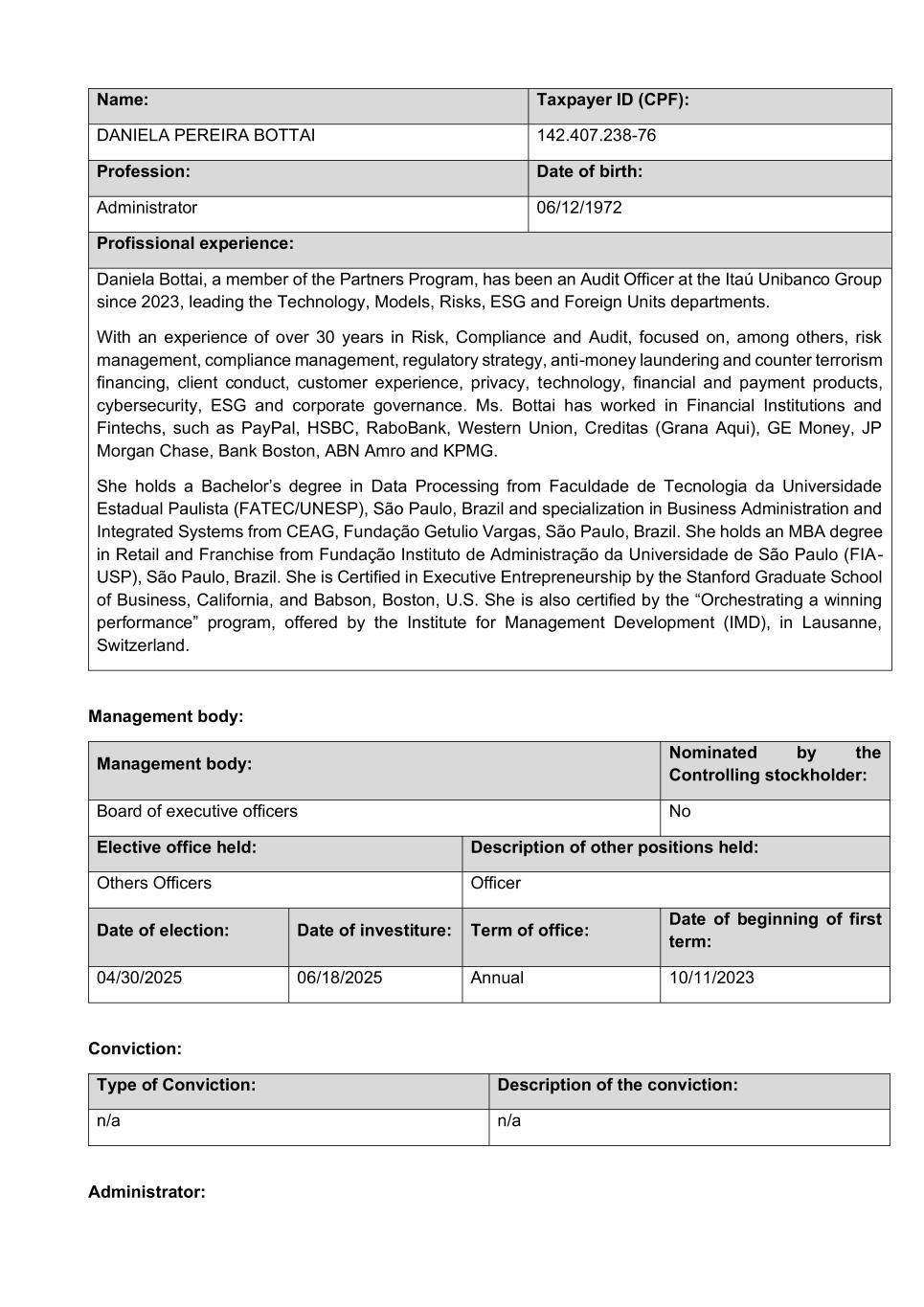 Name: Taxpayer ID (CPF): DANIELA PEREIRA BOTTAI 142.407.238-76 Profession: Date of birth: Administrator 06/12/1972 Profissional experience: Daniela Bottai, a member of the Partners Program, has been an Audit Officer at the Itaú Unibanco Group since 2023, leading the Technology, Models, Risks, ESG and Foreign Units departments. With an experience of over 30 years in Risk, Compliance and Audit, focused on, among others, risk management, compliance management, regulatory strategy, anti-money laundering and counter terrorism financing, client conduct, customer experience, privacy, technology, financial and payment products, cybersecurity, ESG and corporate governance. Ms. Bottai has worked in Financial Institutions and Fintechs, such as PayPal, HSBC, RaboBank, Western Union, Creditas (Grana Aqui), GE Money, JP Morgan Chase, Bank Boston, ABN Amro and KPMG. She holds a Bachelor’s degree in Data Processing from Faculdade de Tecnologia da Universidade Estadual Paulista (FATEC/UNESP), São Paulo, Brazil and specialization in Business Administration and Integrated Systems from CEAG, Fundação Getulio Vargas, São Paulo, Brazil. She holds an MBA degree in Retail and Franchise from Fundação Instituto de Administração da Universidade de São Paulo (FIA- USP), São Paulo, Brazil. She is Certified in Executive Entrepreneurship by the Stanford Graduate School of Business, California, and Babson, Boston, U.S. She is also certified by the “Orchestrating a winning performance” program, offered by the Institute for Management Development (IMD), in Lausanne, Switzerland. Management body: Management body: Nominated by the Controlling stockholder: Board of executive officers No Elective office held: Description of other positions held: Others Officers Officer Date of election: Date of investiture: Term of office: Date of beginning of first term: 04/30/2025 06/18/2025 Annual 10/11/2023 Conviction: Type of Conviction: Description of the conviction: n/a n/a Administrator: