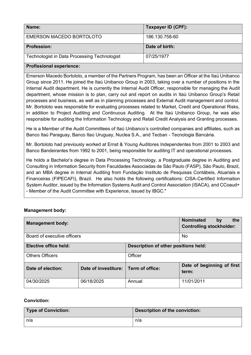 Name: Taxpayer ID (CPF): EMERSON MACEDO BORTOLOTO 186.130.758-60 Profession: Date of birth: Technologist in Data Processing Technologist 07/25/1977 Profissional experience: Emerson Macedo Bortoloto, a member of the Partners Program, has been an Officer at the Itaú Unibanco Group since 2011. He joined the Itaú Unibanco Group in 2003, taking over a number of positions in the Internal Audit department. He is currently the Internal Audit Officer, responsible for managing the Audit department, whose mission is to plan, carry out and report on audits in Itaú Unibanco Group’s Retail processes and business, as well as in planning processes and External Audit management and control. Mr. Bortoloto was responsible for evaluating processes related to Market, Credit and Operational Risks, in addition to Project Auditing and Continuous Auditing. At the Itaú Unibanco Group, he was also responsible for auditing the Information Technology and Retail Credit Analysis and Granting processes. He is a Member of the Audit Committees of Itaú Unibanco’s controlled companies and affiliates, such as Banco Itaú Paraguay, Banco Itaú Uruguay, Nuclea S.A., and Tecban - Tecnologia Bancária. Mr. Bortoloto had previously worked at Ernst & Young Auditores Independentes from 2001 to 2003 and Banco Bandeirantes from 1992 to 2001, being responsible for auditing IT and operational processes. He holds a Bachelor’s degree in Data Processing Technology, a Postgraduate degree in Auditing and Consulting in Information Security from Faculdades Associadas de São Paulo (FASP), São Paulo, Brazil, and an MBA degree in Internal Auditing from Fundação Instituto de Pesquisas Contábeis, Atuariais e Financeiras (FIPECAFI), Brazil. He also holds the following certifications: CISA-Certified Information System Auditor, issued by the Information Systems Audit and Control Association (ISACA), and CCoaud+ - Member of the Audit Committee with Experience, issued by IBGC." Management body: Management body: Nominated by the Controlling stockholder: Board of executive officers No Elective office held: Description of other positions held: Others Officers Officer Date of election: Date of investiture: Term of office: Date of beginning of first term: 04/30/2025 06/18/2025 Annual 11/01/2011 Conviction: Type of Conviction: Description of the conviction: n/a n/a