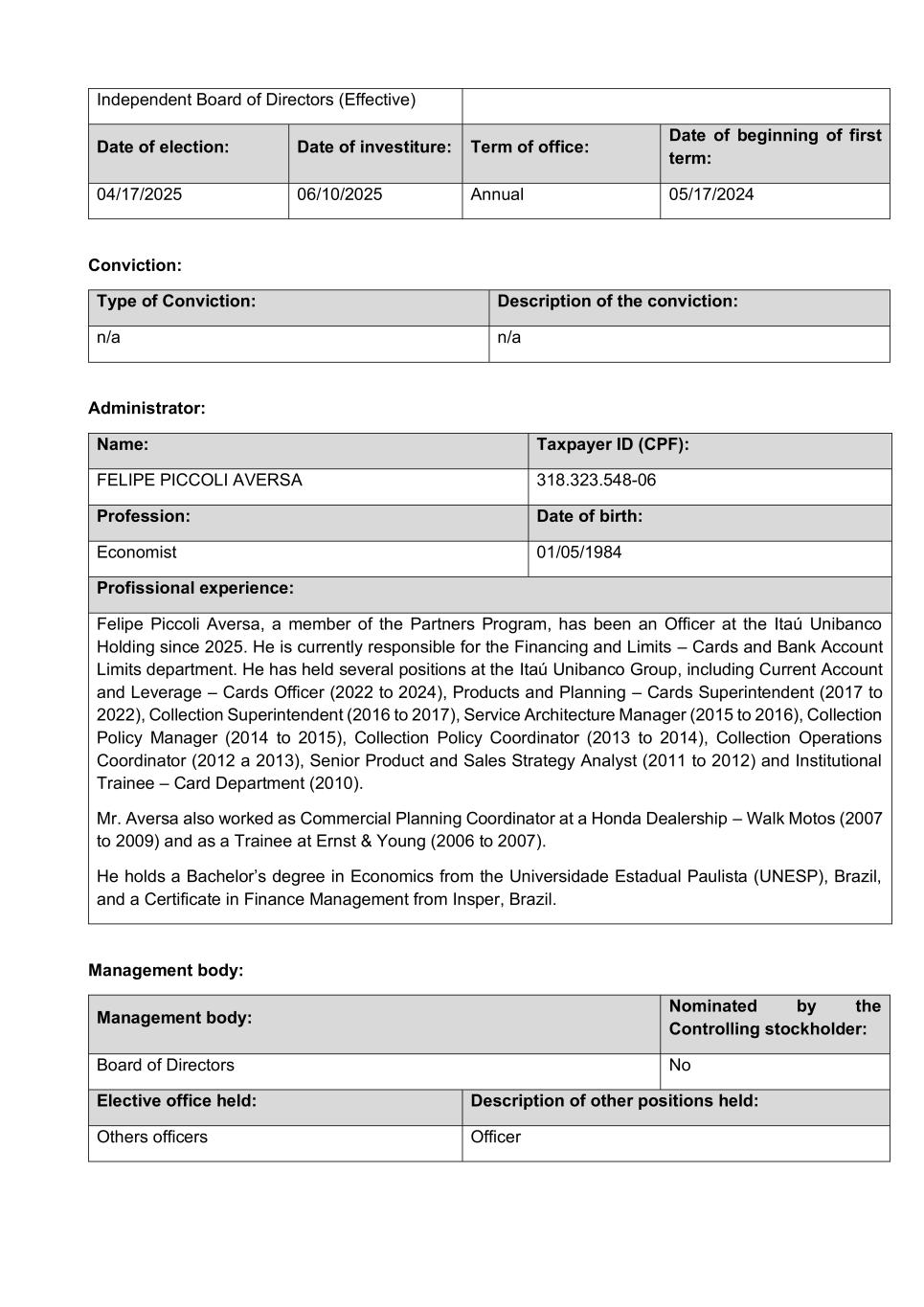 Independent Board of Directors (Effective) Date of election: Date of investiture: Term of office: Date of beginning of first term: 04/17/2025 06/10/2025 Annual 05/17/2024 Conviction: Type of Conviction: Description of the conviction: n/a n/a Administrator: Name: Taxpayer ID (CPF): FELIPE PICCOLI AVERSA 318.323.548-06 Profession: Date of birth: Economist 01/05/1984 Profissional experience: Felipe Piccoli Aversa, a member of the Partners Program, has been an Officer at the Itaú Unibanco Holding since 2025. He is currently responsible for the Financing and Limits – Cards and Bank Account Limits department. He has held several positions at the Itaú Unibanco Group, including Current Account and Leverage – Cards Officer (2022 to 2024), Products and Planning – Cards Superintendent (2017 to 2022), Collection Superintendent (2016 to 2017), Service Architecture Manager (2015 to 2016), Collection Policy Manager (2014 to 2015), Collection Policy Coordinator (2013 to 2014), Collection Operations Coordinator (2012 a 2013), Senior Product and Sales Strategy Analyst (2011 to 2012) and Institutional Trainee – Card Department (2010). Mr. Aversa also worked as Commercial Planning Coordinator at a Honda Dealership – Walk Motos (2007 to 2009) and as a Trainee at Ernst & Young (2006 to 2007). He holds a Bachelor’s degree in Economics from the Universidade Estadual Paulista (UNESP), Brazil, and a Certificate in Finance Management from Insper, Brazil. Management body: Management body: Nominated by the Controlling stockholder: Board of Directors No Elective office held: Description of other positions held: Others officers Officer