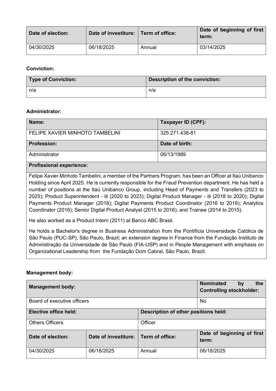 Date of election: Date of investiture: Term of office: Date of beginning of first term: 04/30/2025 06/18/2025 Annual 03/14/2025 Conviction: Type of Conviction: Description of the conviction: n/a n/a Administrator: Name: Taxpayer ID (CPF): FELIPE XAVIER MINHOTO TAMBELINI 325.271.438-81 Profession: Date of birth: Administrator 06/13/1989 Profissional experience: Felipe Xavier Minhoto Tambelini, a member of the Partners Program, has been an Officer at Itaú Unibanco Holding since April 2025. He is currently responsible for the Fraud Prevention department. He has held a number of positions at the Itaú Unibanco Group, including Head of Payments and Transfers (2023 to 2025); Product Superintendent - iti (2020 to 2023); Digital Product Manager - iti (2018 to 2020); Digital Payments Product Manager (2018); Digital Payments Product Coordinator (2016 to 2018); Analytics Coordinator (2016); Senior Digital Product Analyst (2015 to 2016); and Trainee (2014 to 2015). He also worked as a Product Intern (2011) at Banco ABC Brasil. He holds a Bachelor's degree in Business Administration from the Pontifícia Universidade Católica de São Paulo (PUC-SP), São Paulo, Brazil; an extension degree in Finance from the Fundação Instituto de Administração da Universidade de São Paulo (FIA-USP) and in People Management with emphasis on Organizational Leadership from the Fundação Dom Cabral, São Paulo, Brazil. Management body: Management body: Nominated by the Controlling stockholder: Board of executive officers No Elective office held: Description of other positions held: Others Officers Officer Date of election: Date of investiture: Term of office: Date of beginning of first term: 04/30/2025 06/18/2025 Annual 06/18/2025