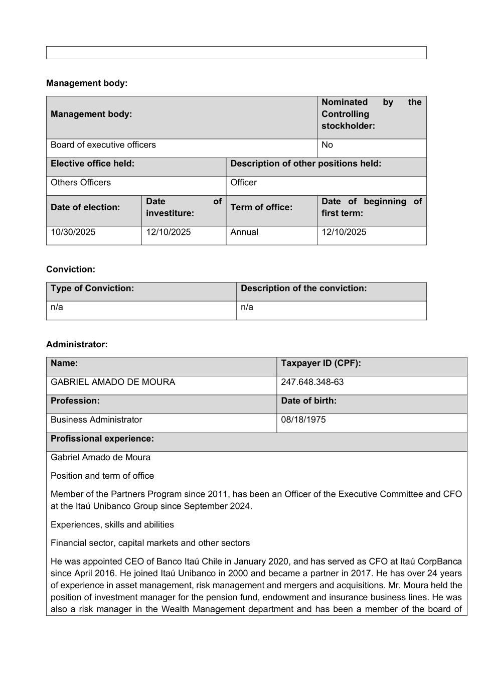 Management body: Management body: Nominated by the Controlling stockholder: Board of executive officers No Elective office held: Description of other positions held: Others Officers Officer Date of election: Date of investiture: Term of office: Date of beginning of first term: 10/30/2025 12/10/2025 Annual 12/10/2025 Conviction: Type of Conviction: Description of the conviction: n/a n/a Administrator: Name: Taxpayer ID (CPF): GABRIEL AMADO DE MOURA 247.648.348-63 Profession: Date of birth: Business Administrator 08/18/1975 Profissional experience: Gabriel Amado de Moura Position and term of office Member of the Partners Program since 2011, has been an Officer of the Executive Committee and CFO at the Itaú Unibanco Group since September 2024. Experiences, skills and abilities Financial sector, capital markets and other sectors He was appointed CEO of Banco Itaú Chile in January 2020, and has served as CFO at Itaú CorpBanca since April 2016. He joined Itaú Unibanco in 2000 and became a partner in 2017. He has over 24 years of experience in asset management, risk management and mergers and acquisitions. Mr. Moura held the position of investment manager for the pension fund, endowment and insurance business lines. He was also a risk manager in the Wealth Management department and has been a member of the board of