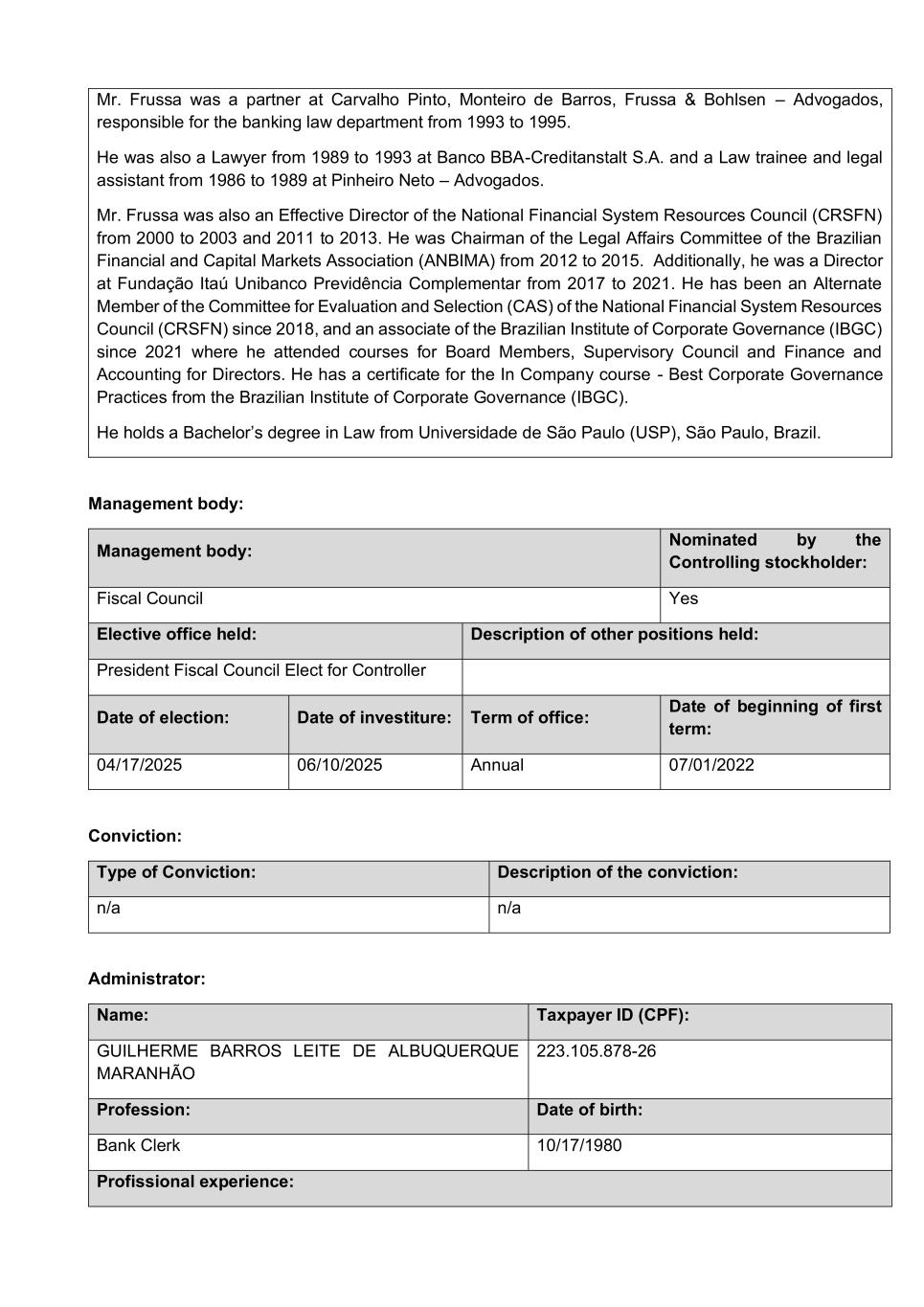 Mr. Frussa was a partner at Carvalho Pinto, Monteiro de Barros, Frussa & Bohlsen – Advogados, responsible for the banking law department from 1993 to 1995. He was also a Lawyer from 1989 to 1993 at Banco BBA-Creditanstalt S.A. and a Law trainee and legal assistant from 1986 to 1989 at Pinheiro Neto – Advogados. Mr. Frussa was also an Effective Director of the National Financial System Resources Council (CRSFN) from 2000 to 2003 and 2011 to 2013. He was Chairman of the Legal Affairs Committee of the Brazilian Financial and Capital Markets Association (ANBIMA) from 2012 to 2015. Additionally, he was a Director at Fundação Itaú Unibanco Previdência Complementar from 2017 to 2021. He has been an Alternate Member of the Committee for Evaluation and Selection (CAS) of the National Financial System Resources Council (CRSFN) since 2018, and an associate of the Brazilian Institute of Corporate Governance (IBGC) since 2021 where he attended courses for Board Members, Supervisory Council and Finance and Accounting for Directors. He has a certificate for the In Company course - Best Corporate Governance Practices from the Brazilian Institute of Corporate Governance (IBGC). He holds a Bachelor’s degree in Law from Universidade de São Paulo (USP), São Paulo, Brazil. Management body: Management body: Nominated by the Controlling stockholder: Fiscal Council Yes Elective office held: Description of other positions held: President Fiscal Council Elect for Controller Date of election: Date of investiture: Term of office: Date of beginning of first term: 04/17/2025 06/10/2025 Annual 07/01/2022 Conviction: Type of Conviction: Description of the conviction: n/a n/a Administrator: Name: Taxpayer ID (CPF): GUILHERME BARROS LEITE DE ALBUQUERQUE MARANHÃO 223.105.878-26 Profession: Date of birth: Bank Clerk 10/17/1980 Profissional experience: