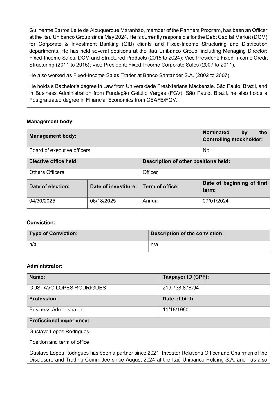 Guilherme Barros Leite de Albuquerque Maranhão, member of the Partners Program, has been an Officer at the Itaú Unibanco Group since May 2024. He is currently responsible for the Debt Capital Market (DCM) for Corporate & Investment Banking (CIB) clients and Fixed-Income Structuring and Distribution departments. He has held several positions at the Itaú Unibanco Group, including Managing Director: Fixed-Income Sales, DCM and Structured Products (2015 to 2024); Vice President: Fixed-Income Credit Structuring (2011 to 2015); Vice President: Fixed-Income Corporate Sales (2007 to 2011). He also worked as Fixed-Income Sales Trader at Banco Santander S.A. (2002 to 2007). He holds a Bachelor’s degree in Law from Universidade Presbiteriana Mackenzie, São Paulo, Brazil, and in Business Administration from Fundação Getulio Vargas (FGV), São Paulo, Brazil, he also holds a Postgratuated degree in Financial Economics from CEAFE/FGV. Management body: Management body: Nominated by the Controlling stockholder: Board of executive officers No Elective office held: Description of other positions held: Others Officers Officer Date of election: Date of investiture: Term of office: Date of beginning of first term: 04/30/2025 06/18/2025 Annual 07/01/2024 Conviction: Type of Conviction: Description of the conviction: n/a n/a Administrator: Name: Taxpayer ID (CPF): GUSTAVO LOPES RODRIGUES 219.738.878-94 Profession: Date of birth: Business Administrator 11/18/1980 Profissional experience: Gustavo Lopes Rodrigues Position and term of office Gustavo Lopes Rodrigues has been a partner since 2021, Investor Relations Officer and Chairman of the Disclosure and Trading Committee since August 2024 at the Itaú Unibanco Holding S.A. and has also