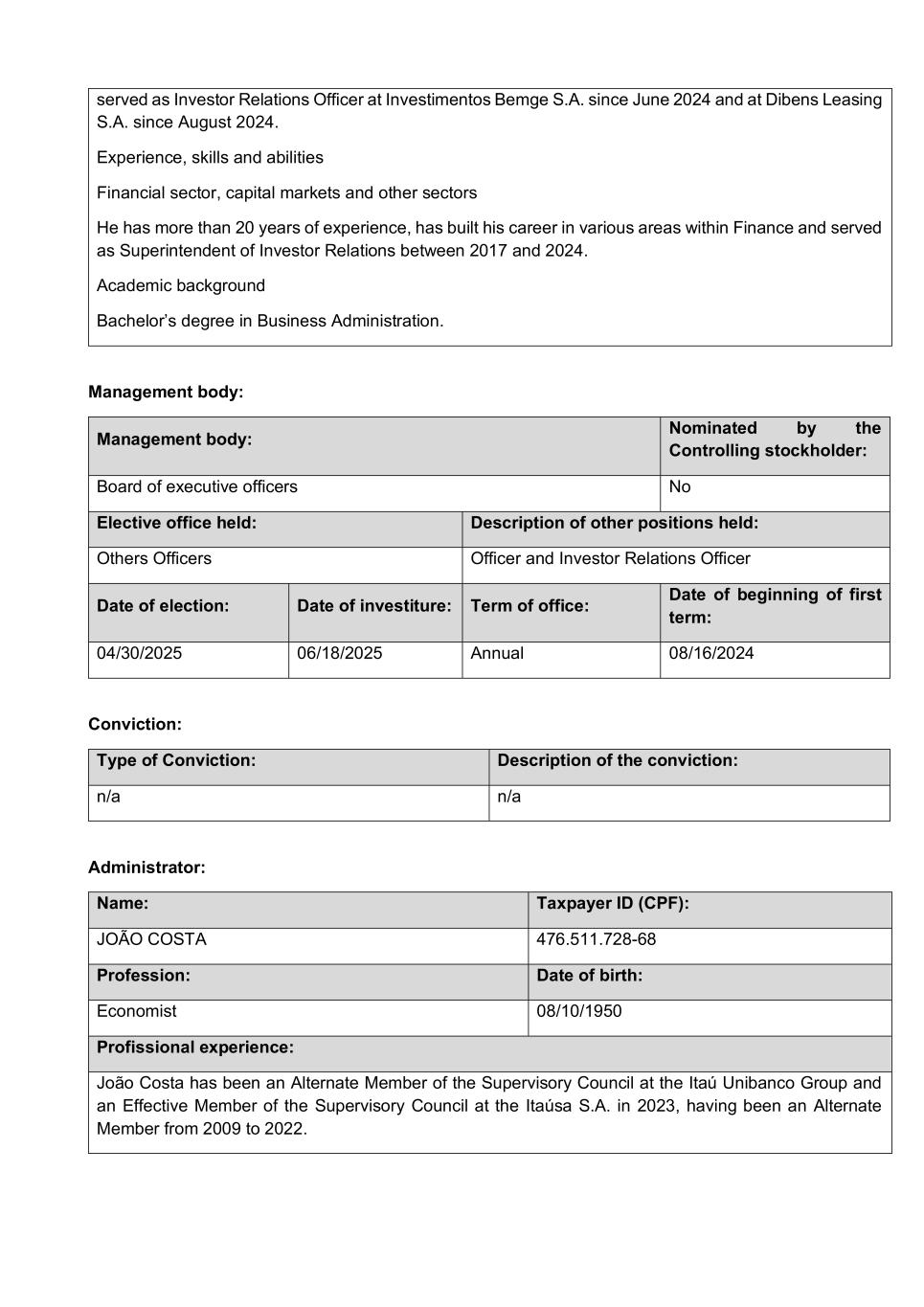 served as Investor Relations Officer at Investimentos Bemge S.A. since June 2024 and at Dibens Leasing S.A. since August 2024. Experience, skills and abilities Financial sector, capital markets and other sectors He has more than 20 years of experience, has built his career in various areas within Finance and served as Superintendent of Investor Relations between 2017 and 2024. Academic background Bachelor’s degree in Business Administration. Management body: Management body: Nominated by the Controlling stockholder: Board of executive officers No Elective office held: Description of other positions held: Others Officers Officer and Investor Relations Officer Date of election: Date of investiture: Term of office: Date of beginning of first term: 04/30/2025 06/18/2025 Annual 08/16/2024 Conviction: Type of Conviction: Description of the conviction: n/a n/a Administrator: Name: Taxpayer ID (CPF): JOÃO COSTA 476.511.728-68 Profession: Date of birth: Economist 08/10/1950 Profissional experience: João Costa has been an Alternate Member of the Supervisory Council at the Itaú Unibanco Group and an Effective Member of the Supervisory Council at the Itaúsa S.A. in 2023, having been an Alternate Member from 2009 to 2022.