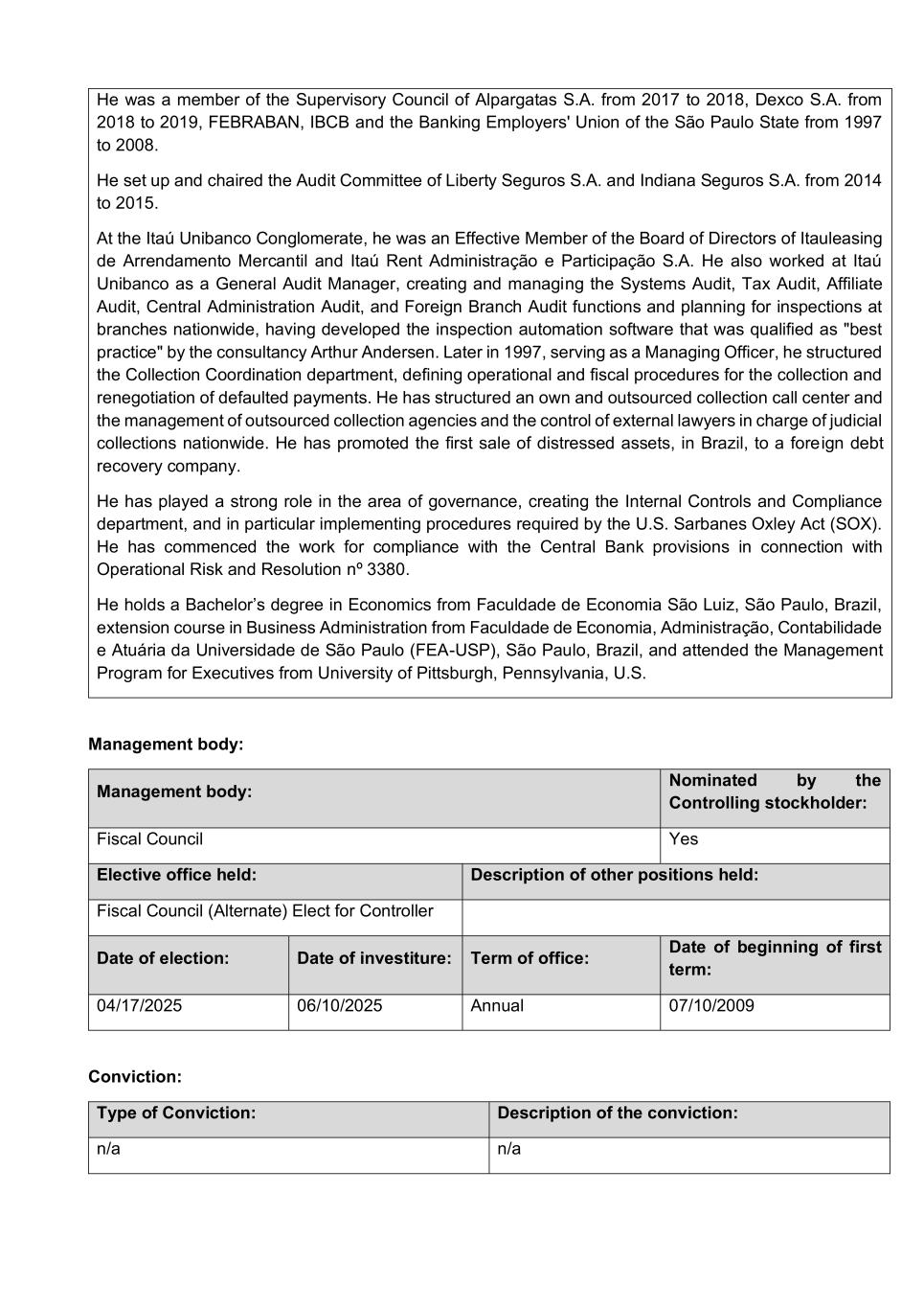 He was a member of the Supervisory Council of Alpargatas S.A. from 2017 to 2018, Dexco S.A. from 2018 to 2019, FEBRABAN, IBCB and the Banking Employers' Union of the São Paulo State from 1997 to 2008. He set up and chaired the Audit Committee of Liberty Seguros S.A. and Indiana Seguros S.A. from 2014 to 2015. At the Itaú Unibanco Conglomerate, he was an Effective Member of the Board of Directors of Itauleasing de Arrendamento Mercantil and Itaú Rent Administração e Participação S.A. He also worked at Itaú Unibanco as a General Audit Manager, creating and managing the Systems Audit, Tax Audit, Affiliate Audit, Central Administration Audit, and Foreign Branch Audit functions and planning for inspections at branches nationwide, having developed the inspection automation software that was qualified as "best practice" by the consultancy Arthur Andersen. Later in 1997, serving as a Managing Officer, he structured the Collection Coordination department, defining operational and fiscal procedures for the collection and renegotiation of defaulted payments. He has structured an own and outsourced collection call center and the management of outsourced collection agencies and the control of external lawyers in charge of judicial collections nationwide. He has promoted the first sale of distressed assets, in Brazil, to a foreign debt recovery company. He has played a strong role in the area of governance, creating the Internal Controls and Compliance department, and in particular implementing procedures required by the U.S. Sarbanes Oxley Act (SOX). He has commenced the work for compliance with the Central Bank provisions in connection with Operational Risk and Resolution nº 3380. He holds a Bachelor’s degree in Economics from Faculdade de Economia São Luiz, São Paulo, Brazil, extension course in Business Administration from Faculdade de Economia, Administração, Contabilidade e Atuária da Universidade de São Paulo (FEA-USP), São Paulo, Brazil, and attended the Management Program for Executives from University of Pittsburgh, Pennsylvania, U.S. Management body: Management body: Nominated by the Controlling stockholder: Fiscal Council Yes Elective office held: Description of other positions held: Fiscal Council (Alternate) Elect for Controller Date of election: Date of investiture: Term of office: Date of beginning of first term: 04/17/2025 06/10/2025 Annual 07/10/2009 Conviction: Type of Conviction: Description of the conviction: n/a n/a