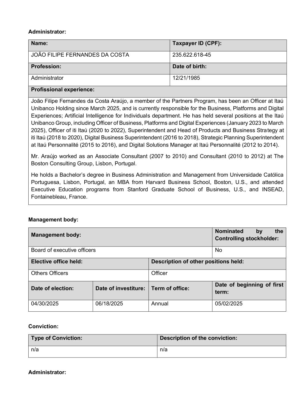 Administrator: Name: Taxpayer ID (CPF): JOÃO FILIPE FERNANDES DA COSTA 235.622.618-45 Profession: Date of birth: Administrator 12/21/1985 Profissional experience: João Filipe Fernandes da Costa Araújo, a member of the Partners Program, has been an Officer at Itaú Unibanco Holding since March 2025, and is currently responsible for the Business, Platforms and Digital Experiences; Artificial Intelligence for Individuals department. He has held several positions at the Itaú Unibanco Group, including Officer of Business, Platforms and Digital Experiences (January 2023 to March 2025), Officer of iti Itaú (2020 to 2022), Superintendent and Head of Products and Business Strategy at iti Itaú (2018 to 2020), Digital Business Superintendent (2016 to 2018), Strategic Planning Superintendent at Itaú Personnalité (2015 to 2016), and Digital Solutions Manager at Itaú Personnalité (2012 to 2014). Mr. Araújo worked as an Associate Consultant (2007 to 2010) and Consultant (2010 to 2012) at The Boston Consulting Group, Lisbon, Portugal. He holds a Bachelor’s degree in Business Administration and Management from Universidade Católica Portuguesa, Lisbon, Portugal, an MBA from Harvard Business School, Boston, U.S., and attended Executive Education programs from Stanford Graduate School of Business, U.S., and INSEAD, Fontainebleau, France. Management body: Management body: Nominated by the Controlling stockholder: Board of executive officers No Elective office held: Description of other positions held: Others Officers Officer Date of election: Date of investiture: Term of office: Date of beginning of first term: 04/30/2025 06/18/2025 Annual 05/02/2025 Conviction: Type of Conviction: Description of the conviction: n/a n/a Administrator: