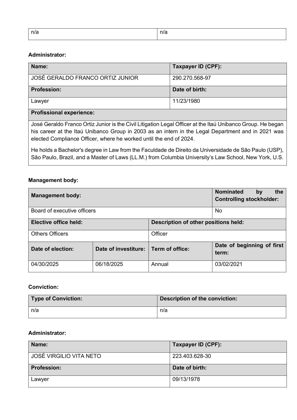 n/a n/a Administrator: Name: Taxpayer ID (CPF): JOSÉ GERALDO FRANCO ORTIZ JUNIOR 290.270.568-97 Profession: Date of birth: Lawyer 11/23/1980 Profissional experience: José Geraldo Franco Ortiz Junior is the Civil Litigation Legal Officer at the Itaú Unibanco Group. He began his career at the Itaú Unibanco Group in 2003 as an intern in the Legal Department and in 2021 was elected Compliance Officer, where he worked until the end of 2024. He holds a Bachelor's degree in Law from the Faculdade de Direito da Universidade de São Paulo (USP), São Paulo, Brazil, and a Master of Laws (LL.M.) from Columbia University’s Law School, New York, U.S. Management body: Management body: Nominated by the Controlling stockholder: Board of executive officers No Elective office held: Description of other positions held: Others Officers Officer Date of election: Date of investiture: Term of office: Date of beginning of first term: 04/30/2025 06/18/2025 Annual 03/02/2021 Conviction: Type of Conviction: Description of the conviction: n/a n/a Administrator: Name: Taxpayer ID (CPF): JOSÉ VIRGILIO VITA NETO 223.403.628-30 Profession: Date of birth: Lawyer 09/13/1978