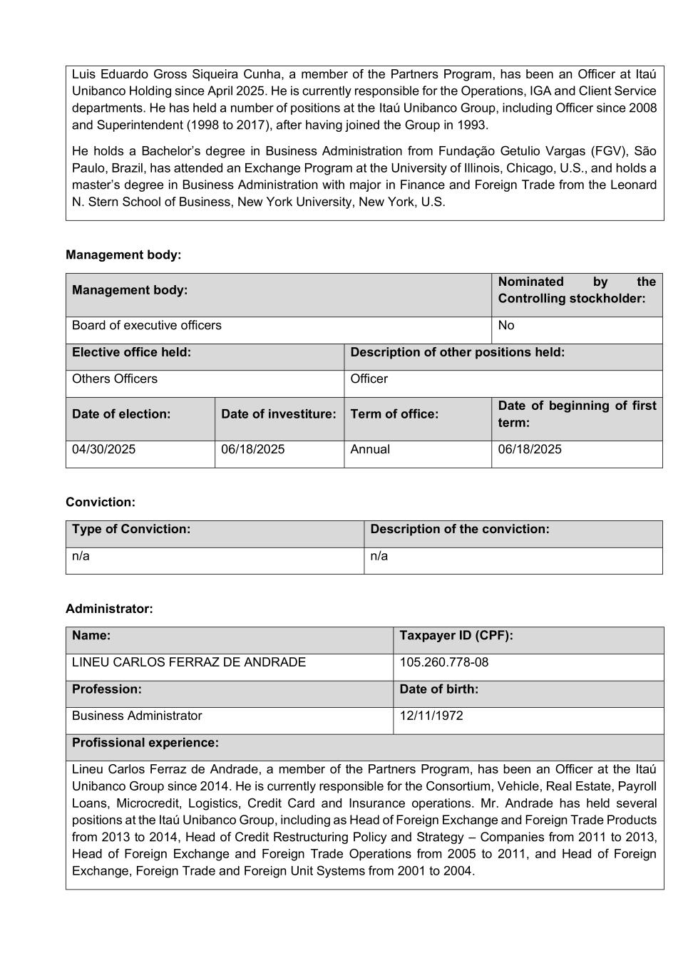 Luis Eduardo Gross Siqueira Cunha, a member of the Partners Program, has been an Officer at Itaú Unibanco Holding since April 2025. He is currently responsible for the Operations, IGA and Client Service departments. He has held a number of positions at the Itaú Unibanco Group, including Officer since 2008 and Superintendent (1998 to 2017), after having joined the Group in 1993. He holds a Bachelor’s degree in Business Administration from Fundação Getulio Vargas (FGV), São Paulo, Brazil, has attended an Exchange Program at the University of Illinois, Chicago, U.S., and holds a master’s degree in Business Administration with major in Finance and Foreign Trade from the Leonard N. Stern School of Business, New York University, New York, U.S. Management body: Management body: Nominated by the Controlling stockholder: Board of executive officers No Elective office held: Description of other positions held: Others Officers Officer Date of election: Date of investiture: Term of office: Date of beginning of first term: 04/30/2025 06/18/2025 Annual 06/18/2025 Conviction: Type of Conviction: Description of the conviction: n/a n/a Administrator: Name: Taxpayer ID (CPF): LINEU CARLOS FERRAZ DE ANDRADE 105.260.778-08 Profession: Date of birth: Business Administrator 12/11/1972 Profissional experience: Lineu Carlos Ferraz de Andrade, a member of the Partners Program, has been an Officer at the Itaú Unibanco Group since 2014. He is currently responsible for the Consortium, Vehicle, Real Estate, Payroll Loans, Microcredit, Logistics, Credit Card and Insurance operations. Mr. Andrade has held several positions at the Itaú Unibanco Group, including as Head of Foreign Exchange and Foreign Trade Products from 2013 to 2014, Head of Credit Restructuring Policy and Strategy – Companies from 2011 to 2013, Head of Foreign Exchange and Foreign Trade Operations from 2005 to 2011, and Head of Foreign Exchange, Foreign Trade and Foreign Unit Systems from 2001 to 2004.