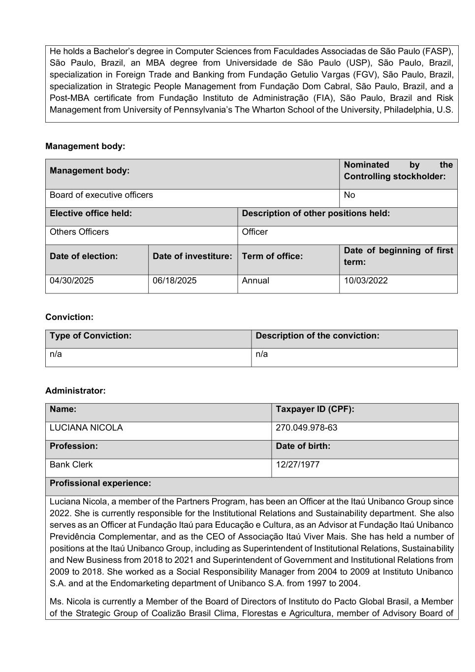 He holds a Bachelor’s degree in Computer Sciences from Faculdades Associadas de São Paulo (FASP), São Paulo, Brazil, an MBA degree from Universidade de São Paulo (USP), São Paulo, Brazil, specialization in Foreign Trade and Banking from Fundação Getulio Vargas (FGV), São Paulo, Brazil, specialization in Strategic People Management from Fundação Dom Cabral, São Paulo, Brazil, and a Post-MBA certificate from Fundação Instituto de Administração (FIA), São Paulo, Brazil and Risk Management from University of Pennsylvania’s The Wharton School of the University, Philadelphia, U.S. Management body: Management body: Nominated by the Controlling stockholder: Board of executive officers No Elective office held: Description of other positions held: Others Officers Officer Date of election: Date of investiture: Term of office: Date of beginning of first term: 04/30/2025 06/18/2025 Annual 10/03/2022 Conviction: Type of Conviction: Description of the conviction: n/a n/a Administrator: Name: Taxpayer ID (CPF): LUCIANA NICOLA 270.049.978-63 Profession: Date of birth: Bank Clerk 12/27/1977 Profissional experience: Luciana Nicola, a member of the Partners Program, has been an Officer at the Itaú Unibanco Group since 2022. She is currently responsible for the Institutional Relations and Sustainability department. She also serves as an Officer at Fundação Itaú para Educação e Cultura, as an Advisor at Fundação Itaú Unibanco Previdência Complementar, and as the CEO of Associação Itaú Viver Mais. She has held a number of positions at the Itaú Unibanco Group, including as Superintendent of Institutional Relations, Sustainability and New Business from 2018 to 2021 and Superintendent of Government and Institutional Relations from 2009 to 2018. She worked as a Social Responsibility Manager from 2004 to 2009 at Instituto Unibanco S.A. and at the Endomarketing department of Unibanco S.A. from 1997 to 2004. Ms. Nicola is currently a Member of the Board of Directors of Instituto do Pacto Global Brasil, a Member of the Strategic Group of Coalizão Brasil Clima, Florestas e Agricultura, member of Advisory Board of