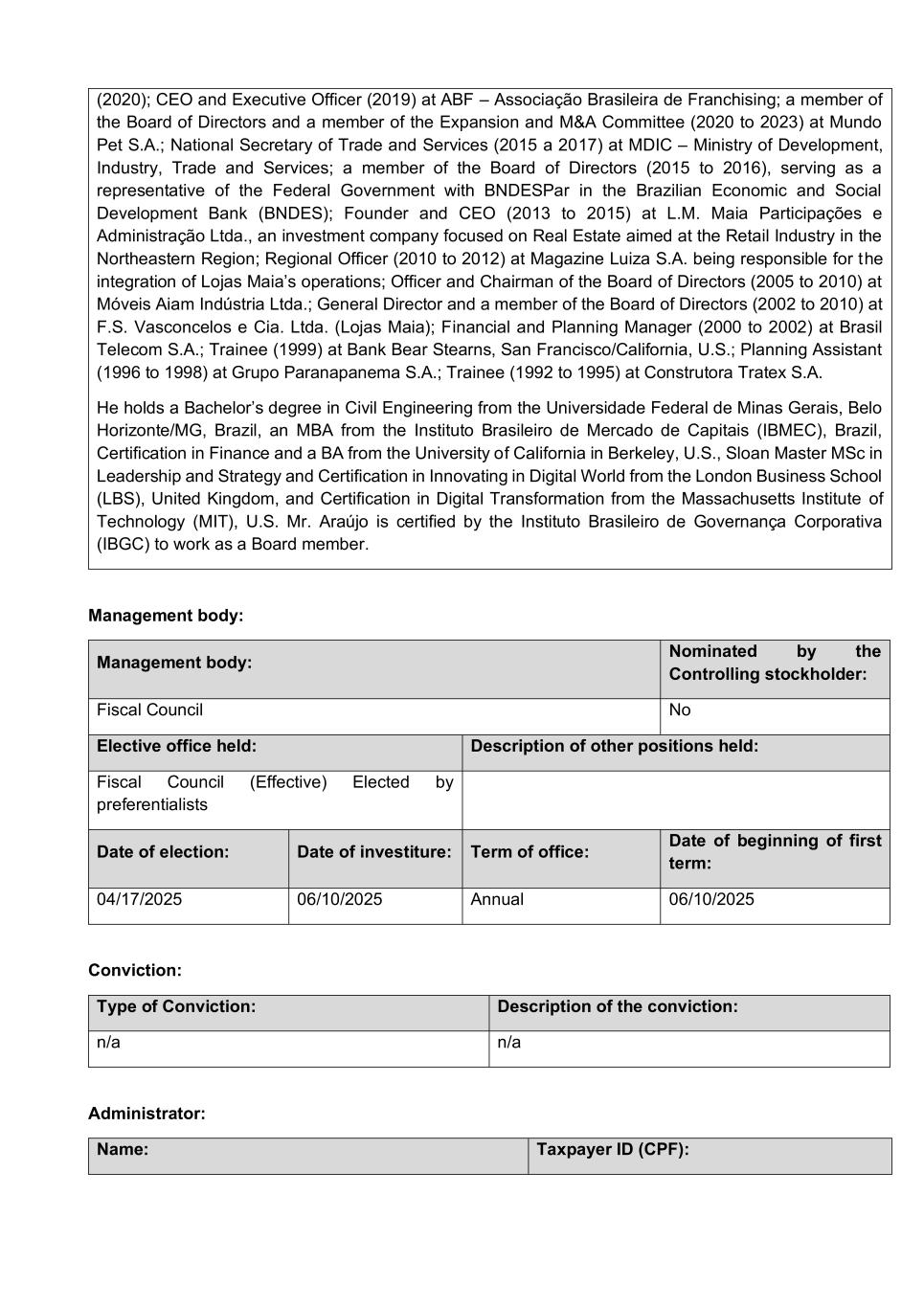 (2020); CEO and Executive Officer (2019) at ABF – Associação Brasileira de Franchising; a member of the Board of Directors and a member of the Expansion and M&A Committee (2020 to 2023) at Mundo Pet S.A.; National Secretary of Trade and Services (2015 a 2017) at MDIC – Ministry of Development, Industry, Trade and Services; a member of the Board of Directors (2015 to 2016), serving as a representative of the Federal Government with BNDESPar in the Brazilian Economic and Social Development Bank (BNDES); Founder and CEO (2013 to 2015) at L.M. Maia Participações e Administração Ltda., an investment company focused on Real Estate aimed at the Retail Industry in the Northeastern Region; Regional Officer (2010 to 2012) at Magazine Luiza S.A. being responsible for the integration of Lojas Maia’s operations; Officer and Chairman of the Board of Directors (2005 to 2010) at Móveis Aiam Indústria Ltda.; General Director and a member of the Board of Directors (2002 to 2010) at F.S. Vasconcelos e Cia. Ltda. (Lojas Maia); Financial and Planning Manager (2000 to 2002) at Brasil Telecom S.A.; Trainee (1999) at Bank Bear Stearns, San Francisco/California, U.S.; Planning Assistant (1996 to 1998) at Grupo Paranapanema S.A.; Trainee (1992 to 1995) at Construtora Tratex S.A. He holds a Bachelor’s degree in Civil Engineering from the Universidade Federal de Minas Gerais, Belo Horizonte/MG, Brazil, an MBA from the Instituto Brasileiro de Mercado de Capitais (IBMEC), Brazil, Certification in Finance and a BA from the University of California in Berkeley, U.S., Sloan Master MSc in Leadership and Strategy and Certification in Innovating in Digital World from the London Business School (LBS), United Kingdom, and Certification in Digital Transformation from the Massachusetts Institute of Technology (MIT), U.S. Mr. Araújo is certified by the Instituto Brasileiro de Governança Corporativa (IBGC) to work as a Board member. Management body: Management body: Nominated by the Controlling stockholder: Fiscal Council No Elective office held: Description of other positions held: Fiscal Council (Effective) Elected by preferentialists Date of election: Date of investiture: Term of office: Date of beginning of first term: 04/17/2025 06/10/2025 Annual 06/10/2025 Conviction: Type of Conviction: Description of the conviction: n/a n/a Administrator: Name: Taxpayer ID (CPF):