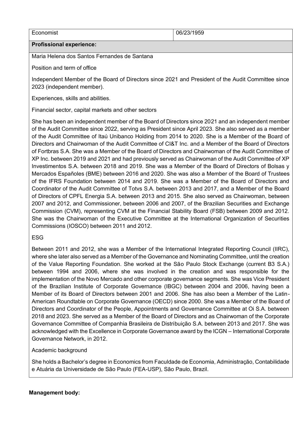 Economist 06/23/1959 Profissional experience: Maria Helena dos Santos Fernandes de Santana Position and term of office Independent Member of the Board of Directors since 2021 and President of the Audit Committee since 2023 (independent member). Experiences, skills and abilities. Financial sector, capital markets and other sectors She has been an independent member of the Board of Directors since 2021 and an independent member of the Audit Committee since 2022, serving as President since April 2023. She also served as a member of the Audit Committee of Itaú Unibanco Holding from 2014 to 2020. She is a Member of the Board of Directors and Chairwoman of the Audit Committee of CI&T Inc. and a Member of the Board of Directors of Fortbras S.A. She was a Member of the Board of Directors and Chairwoman of the Audit Committee of XP Inc. between 2019 and 2021 and had previously served as Chairwoman of the Audit Committee of XP Investimentos S.A. between 2018 and 2019. She was a Member of the Board of Directors of Bolsas y Mercados Españoles (BME) between 2016 and 2020. She was also a Member of the Board of Trustees of the IFRS Foundation between 2014 and 2019. She was a Member of the Board of Directors and Coordinator of the Audit Committee of Totvs S.A. between 2013 and 2017, and a Member of the Board of Directors of CPFL Energia S.A. between 2013 and 2015. She also served as Chairwoman, between 2007 and 2012, and Commissioner, between 2006 and 2007, of the Brazilian Securities and Exchange Commission (CVM), representing CVM at the Financial Stability Board (FSB) between 2009 and 2012. She was the Chairwoman of the Executive Committee at the International Organization of Securities Commissions (IOSCO) between 2011 and 2012. ESG Between 2011 and 2012, she was a Member of the International Integrated Reporting Council (IIRC), where she later also served as a Member of the Governance and Nominating Committee, until the creation of the Value Reporting Foundation. She worked at the São Paulo Stock Exchange (current B3 S.A.) between 1994 and 2006, where she was involved in the creation and was responsible for the implementation of the Novo Mercado and other corporate governance segments. She was Vice President of the Brazilian Institute of Corporate Governance (IBGC) between 2004 and 2006, having been a Member of its Board of Directors between 2001 and 2006. She has also been a Member of the Latin- American Roundtable on Corporate Governance (OECD) since 2000. She was a Member of the Board of Directors and Coordinator of the People, Appointments and Governance Committee at Oi S.A. between 2018 and 2023. She served as a Member of the Board of Directors and as Chairwoman of the Corporate Governance Committee of Companhia Brasileira de Distribuição S.A. between 2013 and 2017. She was acknowledged with the Excellence in Corporate Governance award by the ICGN – International Corporate Governance Network, in 2012. Academic background She holds a Bachelor’s degree in Economics from Faculdade de Economia, Administração, Contabilidade e Atuária da Universidade de São Paulo (FEA-USP), São Paulo, Brazil. Management body: