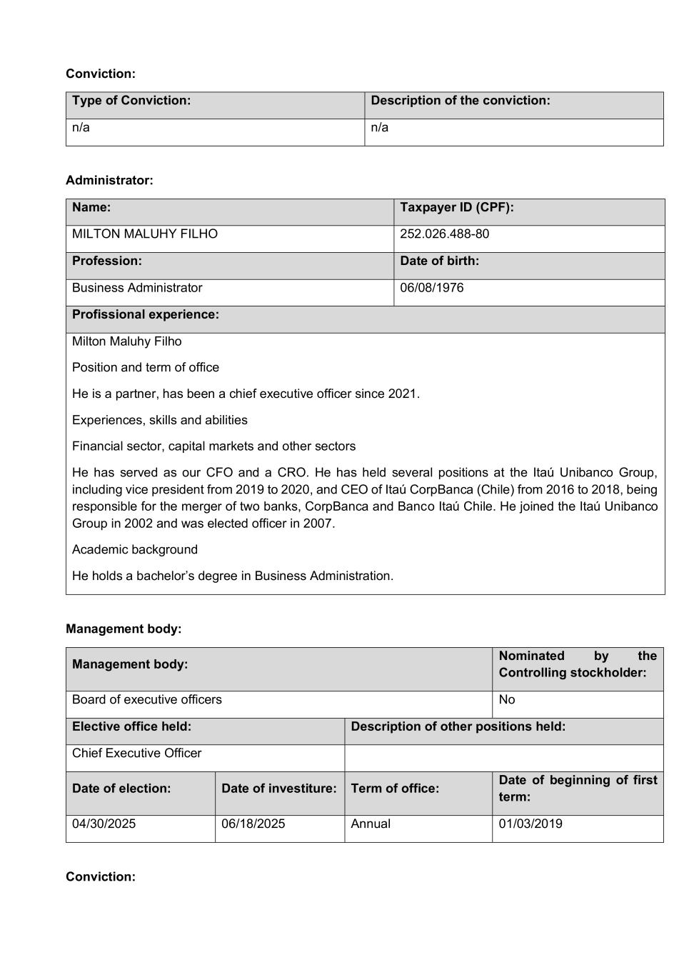 Conviction: Type of Conviction: Description of the conviction: n/a n/a Administrator: Name: Taxpayer ID (CPF): MILTON MALUHY FILHO 252.026.488-80 Profession: Date of birth: Business Administrator 06/08/1976 Profissional experience: Milton Maluhy Filho Position and term of office He is a partner, has been a chief executive officer since 2021. Experiences, skills and abilities Financial sector, capital markets and other sectors He has served as our CFO and a CRO. He has held several positions at the Itaú Unibanco Group, including vice president from 2019 to 2020, and CEO of Itaú CorpBanca (Chile) from 2016 to 2018, being responsible for the merger of two banks, CorpBanca and Banco Itaú Chile. He joined the Itaú Unibanco Group in 2002 and was elected officer in 2007. Academic background He holds a bachelor’s degree in Business Administration. Management body: Management body: Nominated by the Controlling stockholder: Board of executive officers No Elective office held: Description of other positions held: Chief Executive Officer Date of election: Date of investiture: Term of office: Date of beginning of first term: 04/30/2025 06/18/2025 Annual 01/03/2019 Conviction: