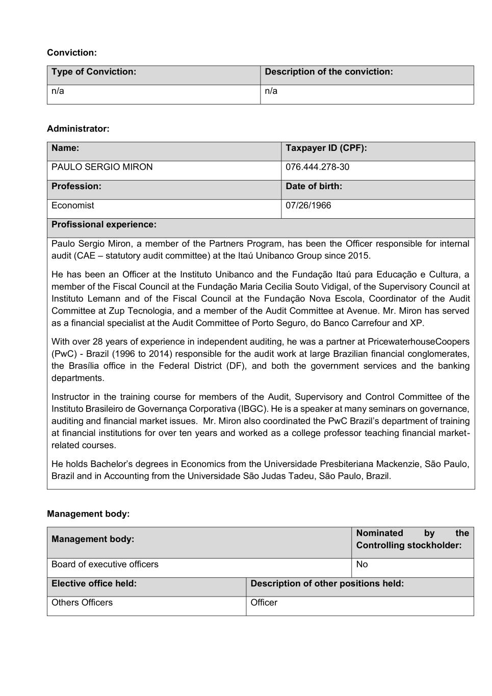 Conviction: Type of Conviction: Description of the conviction: n/a n/a Administrator: Name: Taxpayer ID (CPF): PAULO SERGIO MIRON 076.444.278-30 Profession: Date of birth: Economist 07/26/1966 Profissional experience: Paulo Sergio Miron, a member of the Partners Program, has been the Officer responsible for internal audit (CAE – statutory audit committee) at the Itaú Unibanco Group since 2015. He has been an Officer at the Instituto Unibanco and the Fundação Itaú para Educação e Cultura, a member of the Fiscal Council at the Fundação Maria Cecilia Souto Vidigal, of the Supervisory Council at Instituto Lemann and of the Fiscal Council at the Fundação Nova Escola, Coordinator of the Audit Committee at Zup Tecnologia, and a member of the Audit Committee at Avenue. Mr. Miron has served as a financial specialist at the Audit Committee of Porto Seguro, do Banco Carrefour and XP. With over 28 years of experience in independent auditing, he was a partner at PricewaterhouseCoopers (PwC) - Brazil (1996 to 2014) responsible for the audit work at large Brazilian financial conglomerates, the Brasília office in the Federal District (DF), and both the government services and the banking departments. Instructor in the training course for members of the Audit, Supervisory and Control Committee of the Instituto Brasileiro de Governança Corporativa (IBGC). He is a speaker at many seminars on governance, auditing and financial market issues. Mr. Miron also coordinated the PwC Brazil’s department of training at financial institutions for over ten years and worked as a college professor teaching financial market- related courses. He holds Bachelor’s degrees in Economics from the Universidade Presbiteriana Mackenzie, São Paulo, Brazil and in Accounting from the Universidade São Judas Tadeu, São Paulo, Brazil. Management body: Management body: Nominated by the Controlling stockholder: Board of executive officers No Elective office held: Description of other positions held: Others Officers Officer