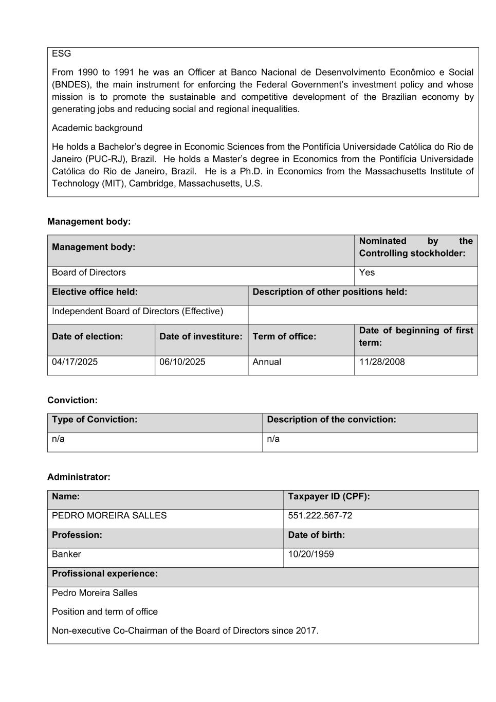 ESG From 1990 to 1991 he was an Officer at Banco Nacional de Desenvolvimento Econômico e Social (BNDES), the main instrument for enforcing the Federal Government’s investment policy and whose mission is to promote the sustainable and competitive development of the Brazilian economy by generating jobs and reducing social and regional inequalities. Academic background He holds a Bachelor’s degree in Economic Sciences from the Pontifícia Universidade Católica do Rio de Janeiro (PUC-RJ), Brazil. He holds a Master’s degree in Economics from the Pontifícia Universidade Católica do Rio de Janeiro, Brazil. He is a Ph.D. in Economics from the Massachusetts Institute of Technology (MIT), Cambridge, Massachusetts, U.S. Management body: Management body: Nominated by the Controlling stockholder: Board of Directors Yes Elective office held: Description of other positions held: Independent Board of Directors (Effective) Date of election: Date of investiture: Term of office: Date of beginning of first term: 04/17/2025 06/10/2025 Annual 11/28/2008 Conviction: Type of Conviction: Description of the conviction: n/a n/a Administrator: Name: Taxpayer ID (CPF): PEDRO MOREIRA SALLES 551.222.567-72 Profession: Date of birth: Banker 10/20/1959 Profissional experience: Pedro Moreira Salles Position and term of office Non-executive Co-Chairman of the Board of Directors since 2017.