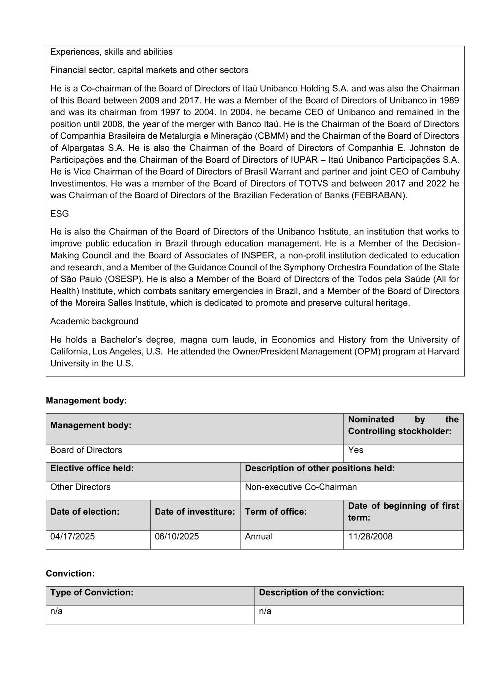 Experiences, skills and abilities Financial sector, capital markets and other sectors He is a Co-chairman of the Board of Directors of Itaú Unibanco Holding S.A. and was also the Chairman of this Board between 2009 and 2017. He was a Member of the Board of Directors of Unibanco in 1989 and was its chairman from 1997 to 2004. In 2004, he became CEO of Unibanco and remained in the position until 2008, the year of the merger with Banco Itaú. He is the Chairman of the Board of Directors of Companhia Brasileira de Metalurgia e Mineração (CBMM) and the Chairman of the Board of Directors of Alpargatas S.A. He is also the Chairman of the Board of Directors of Companhia E. Johnston de Participações and the Chairman of the Board of Directors of IUPAR – Itaú Unibanco Participações S.A. He is Vice Chairman of the Board of Directors of Brasil Warrant and partner and joint CEO of Cambuhy Investimentos. He was a member of the Board of Directors of TOTVS and between 2017 and 2022 he was Chairman of the Board of Directors of the Brazilian Federation of Banks (FEBRABAN). ESG He is also the Chairman of the Board of Directors of the Unibanco Institute, an institution that works to improve public education in Brazil through education management. He is a Member of the Decision- Making Council and the Board of Associates of INSPER, a non-profit institution dedicated to education and research, and a Member of the Guidance Council of the Symphony Orchestra Foundation of the State of São Paulo (OSESP). He is also a Member of the Board of Directors of the Todos pela Saúde (All for Health) Institute, which combats sanitary emergencies in Brazil, and a Member of the Board of Directors of the Moreira Salles Institute, which is dedicated to promote and preserve cultural heritage. Academic background He holds a Bachelor’s degree, magna cum laude, in Economics and History from the University of California, Los Angeles, U.S. He attended the Owner/President Management (OPM) program at Harvard University in the U.S. Management body: Management body: Nominated by the Controlling stockholder: Board of Directors Yes Elective office held: Description of other positions held: Other Directors Non-executive Co-Chairman Date of election: Date of investiture: Term of office: Date of beginning of first term: 04/17/2025 06/10/2025 Annual 11/28/2008 Conviction: Type of Conviction: Description of the conviction: n/a n/a