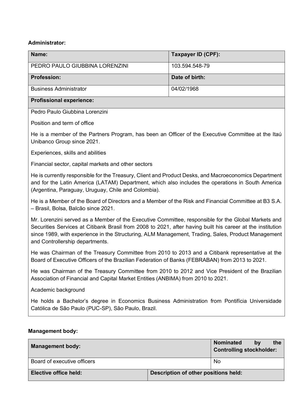 Administrator: Name: Taxpayer ID (CPF): PEDRO PAULO GIUBBINA LORENZINI 103.594.548-79 Profession: Date of birth: Business Administrator 04/02/1968 Profissional experience: Pedro Paulo Giubbina Lorenzini Position and term of office He is a member of the Partners Program, has been an Officer of the Executive Committee at the Itaú Unibanco Group since 2021. Experiences, skills and abilities Financial sector, capital markets and other sectors He is currently responsible for the Treasury, Client and Product Desks, and Macroeconomics Department and for the Latin America (LATAM) Department, which also includes the operations in South America (Argentina, Paraguay, Uruguay, Chile and Colombia). He is a Member of the Board of Directors and a Member of the Risk and Financial Committee at B3 S.A. – Brasil, Bolsa, Balcão since 2021. Mr. Lorenzini served as a Member of the Executive Committee, responsible for the Global Markets and Securities Services at Citibank Brasil from 2008 to 2021, after having built his career at the institution since 1989, with experience in the Structuring, ALM Management, Trading, Sales, Product Management and Controllership departments. He was Chairman of the Treasury Committee from 2010 to 2013 and a Citibank representative at the Board of Executive Officers of the Brazilian Federation of Banks (FEBRABAN) from 2013 to 2021. He was Chairman of the Treasury Committee from 2010 to 2012 and Vice President of the Brazilian Association of Financial and Capital Market Entities (ANBIMA) from 2010 to 2021. Academic background He holds a Bachelor’s degree in Economics Business Administration from Pontifícia Universidade Católica de São Paulo (PUC-SP), São Paulo, Brazil. Management body: Management body: Nominated by the Controlling stockholder: Board of executive officers No Elective office held: Description of other positions held: