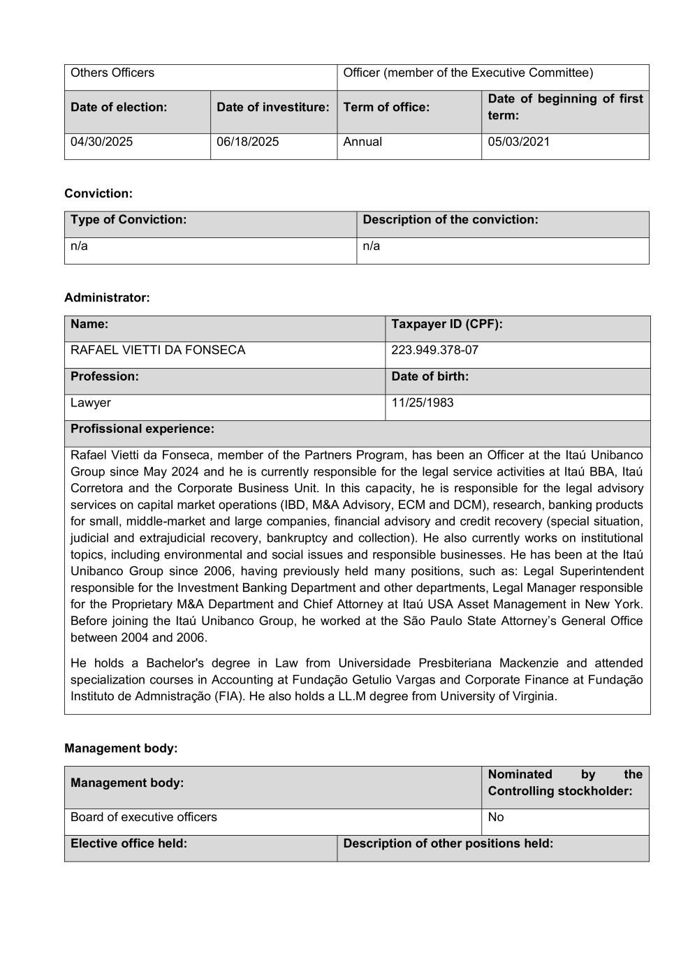 Others Officers Officer (member of the Executive Committee) Date of election: Date of investiture: Term of office: Date of beginning of first term: 04/30/2025 06/18/2025 Annual 05/03/2021 Conviction: Type of Conviction: Description of the conviction: n/a n/a Administrator: Name: Taxpayer ID (CPF): RAFAEL VIETTI DA FONSECA 223.949.378-07 Profession: Date of birth: Lawyer 11/25/1983 Profissional experience: Rafael Vietti da Fonseca, member of the Partners Program, has been an Officer at the Itaú Unibanco Group since May 2024 and he is currently responsible for the legal service activities at Itaú BBA, Itaú Corretora and the Corporate Business Unit. In this capacity, he is responsible for the legal advisory services on capital market operations (IBD, M&A Advisory, ECM and DCM), research, banking products for small, middle-market and large companies, financial advisory and credit recovery (special situation, judicial and extrajudicial recovery, bankruptcy and collection). He also currently works on institutional topics, including environmental and social issues and responsible businesses. He has been at the Itaú Unibanco Group since 2006, having previously held many positions, such as: Legal Superintendent responsible for the Investment Banking Department and other departments, Legal Manager responsible for the Proprietary M&A Department and Chief Attorney at Itaú USA Asset Management in New York. Before joining the Itaú Unibanco Group, he worked at the São Paulo State Attorney’s General Office between 2004 and 2006. He holds a Bachelor's degree in Law from Universidade Presbiteriana Mackenzie and attended specialization courses in Accounting at Fundação Getulio Vargas and Corporate Finance at Fundação Instituto de Admnistração (FIA). He also holds a LL.M degree from University of Virginia. Management body: Management body: Nominated by the Controlling stockholder: Board of executive officers No Elective office held: Description of other positions held: