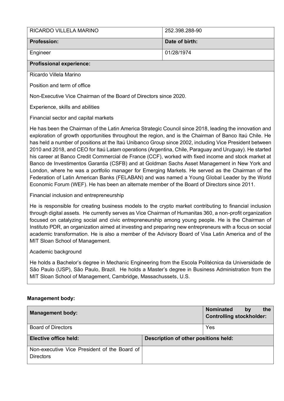 RICARDO VILLELA MARINO 252.398.288-90 Profession: Date of birth: Engineer 01/28/1974 Profissional experience: Ricardo Villela Marino Position and term of office Non-Executive Vice Chairman of the Board of Directors since 2020. Experience, skills and abilities Financial sector and capital markets He has been the Chairman of the Latin America Strategic Council since 2018, leading the innovation and exploration of growth opportunities throughout the region, and is the Chairman of Banco Itaú Chile. He has held a number of positions at the Itaú Unibanco Group since 2002, including Vice President between 2010 and 2018, and CEO for Itaú Latam operations (Argentina, Chile, Paraguay and Uruguay). He started his career at Banco Credit Commercial de France (CCF), worked with fixed income and stock market at Banco de Investimentos Garantia (CSFB) and at Goldman Sachs Asset Management in New York and London, where he was a portfolio manager for Emerging Markets. He served as the Chairman of the Federation of Latin American Banks (FELABAN) and was named a Young Global Leader by the World Economic Forum (WEF). He has been an alternate member of the Board of Directors since 2011. Financial inclusion and entrepreneurship He is responsible for creating business models to the crypto market contributing to financial inclusion through digital assets. He currently serves as Vice Chairman of Humanitas 360, a non-profit organization focused on catalyzing social and civic entrepreneurship among young people. He is the Chairman of Instituto PDR, an organization aimed at investing and preparing new entrepreneurs with a focus on social academic transformation. He is also a member of the Advisory Board of Visa Latin America and of the MIT Sloan School of Management. Academic background He holds a Bachelor’s degree in Mechanic Engineering from the Escola Politécnica da Universidade de São Paulo (USP), São Paulo, Brazil. He holds a Master’s degree in Business Administration from the MIT Sloan School of Management, Cambridge, Massachussets, U.S. Management body: Management body: Nominated by the Controlling stockholder: Board of Directors Yes Elective office held: Description of other positions held: Non-executive Vice President of the Board of Directors