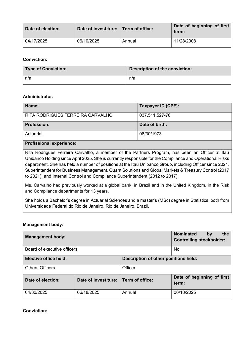 Date of election: Date of investiture: Term of office: Date of beginning of first term: 04/17/2025 06/10/2025 Annual 11/28/2008 Conviction: Type of Conviction: Description of the conviction: n/a n/a Administrator: Name: Taxpayer ID (CPF): RITA RODRIGUES FERREIRA CARVALHO 037.511.527-76 Profession: Date of birth: Actuarial 08/30/1973 Profissional experience: Rita Rodrigues Ferreira Carvalho, a member of the Partners Program, has been an Officer at Itaú Unibanco Holding since April 2025. She is currently responsible for the Compliance and Operational Risks department. She has held a number of positions at the Itaú Unibanco Group, including Officer since 2021, Superintendent for Business Management, Quant Solutions and Global Markets & Treasury Control (2017 to 2021), and Internal Control and Compliance Superintendent (2012 to 2017). Ms. Carvalho had previously worked at a global bank, in Brazil and in the United Kingdom, in the Risk and Compliance departments for 13 years. She holds a Bachelor’s degree in Actuarial Sciences and a master’s (MSc) degree in Statistics, both from Universidade Federal do Rio de Janeiro, Rio de Janeiro, Brazil. Management body: Management body: Nominated by the Controlling stockholder: Board of executive officers No Elective office held: Description of other positions held: Others Officers Officer Date of election: Date of investiture: Term of office: Date of beginning of first term: 04/30/2025 06/18/2025 Annual 06/18/2025 Conviction: