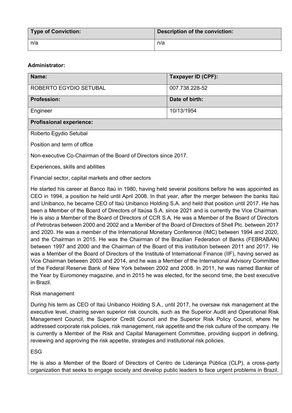 Type of Conviction: Description of the conviction: n/a n/a Administrator: Name: Taxpayer ID (CPF): ROBERTO EGYDIO SETUBAL 007.738.228-52 Profession: Date of birth: Engineer 10/13/1954 Profissional experience: Roberto Egydio Setubal Position and term of office Non-executive Co-Chairman of the Board of Directors since 2017. Experiences, skills and abilities Financial sector, capital markets and other sectors He started his career at Banco Itaú in 1980, having held several positions before he was appointed as CEO in 1994, a position he held until April 2008. In that year, after the merger between the banks Itaú and Unibanco, he became CEO of Itaú Unibanco Holding S.A. and held that position until 2017. He has been a Member of the Board of Directors of Itaúsa S.A. since 2021 and is currently the Vice Chairman. He is also a Member of the Board of Directors of CCR S.A. He was a Member of the Board of Directors of Petrobras between 2000 and 2002 and a Member of the Board of Directors of Shell Plc. between 2017 and 2020. He was a member of the International Monetary Conference (IMC) between 1994 and 2020, and the Chairman in 2015. He was the Chairman of the Brazilian Federation of Banks (FEBRABAN) between 1997 and 2000 and the Chairman of the Board of this institution between 2011 and 2017. He was a Member of the Board of Directors of the Institute of International Finance (IIF), having served as Vice Chairman between 2003 and 2014, and he was a Member of the International Advisory Committee of the Federal Reserve Bank of New York between 2002 and 2008. In 2011, he was named Banker of the Year by Euromoney magazine, and in 2015 he was elected, for the second time, the best executive in Brazil. Risk management During his term as CEO of Itaú Unibanco Holding S.A., until 2017, he oversaw risk management at the executive level, chairing seven superior risk councils, such as the Superior Audit and Operational Risk Management Council, the Superior Credit Council and the Superior Risk Policy Council, where he addressed corporate risk policies, risk management, risk appetite and the risk culture of the company. He is currently a Member of the Risk and Capital Management Committee, providing support in defining, reviewing and approving the risk appetite, strategies and institutional risk policies. ESG He is also a Member of the Board of Directors of Centro de Liderança Pública (CLP), a cross-party organization that seeks to engage society and develop public leaders to face urgent problems in Brazil.