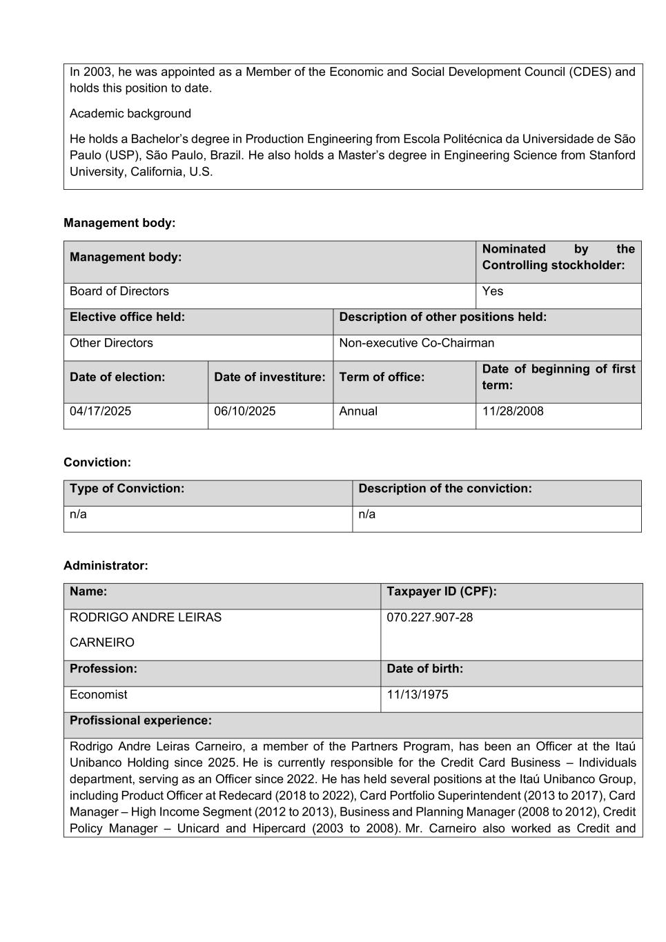 In 2003, he was appointed as a Member of the Economic and Social Development Council (CDES) and holds this position to date. Academic background He holds a Bachelor’s degree in Production Engineering from Escola Politécnica da Universidade de São Paulo (USP), São Paulo, Brazil. He also holds a Master’s degree in Engineering Science from Stanford University, California, U.S. Management body: Management body: Nominated by the Controlling stockholder: Board of Directors Yes Elective office held: Description of other positions held: Other Directors Non-executive Co-Chairman Date of election: Date of investiture: Term of office: Date of beginning of first term: 04/17/2025 06/10/2025 Annual 11/28/2008 Conviction: Type of Conviction: Description of the conviction: n/a n/a Administrator: Name: Taxpayer ID (CPF): RODRIGO ANDRE LEIRAS CARNEIRO 070.227.907-28 Profession: Date of birth: Economist 11/13/1975 Profissional experience: Rodrigo Andre Leiras Carneiro, a member of the Partners Program, has been an Officer at the Itaú Unibanco Holding since 2025. He is currently responsible for the Credit Card Business – Individuals department, serving as an Officer since 2022. He has held several positions at the Itaú Unibanco Group, including Product Officer at Redecard (2018 to 2022), Card Portfolio Superintendent (2013 to 2017), Card Manager – High Income Segment (2012 to 2013), Business and Planning Manager (2008 to 2012), Credit Policy Manager – Unicard and Hipercard (2003 to 2008). Mr. Carneiro also worked as Credit and