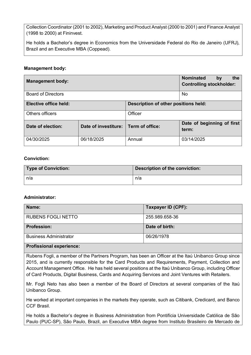 Collection Coordinator (2001 to 2002), Marketing and Product Analyst (2000 to 2001) and Finance Analyst (1998 to 2000) at Fininvest. He holds a Bachelor’s degree in Economics from the Universidade Federal do Rio de Janeiro (UFRJ), Brazil and an Executive MBA (Coppead). Management body: Management body: Nominated by the Controlling stockholder: Board of Directors No Elective office held: Description of other positions held: Others officers Officer Date of election: Date of investiture: Term of office: Date of beginning of first term: 04/30/2025 06/18/2025 Annual 03/14/2025 Conviction: Type of Conviction: Description of the conviction: n/a n/a Administrator: Name: Taxpayer ID (CPF): RUBENS FOGLI NETTO 255.989.658-36 Profession: Date of birth: Business Administrator 06/26/1978 Profissional experience: Rubens Fogli, a member of the Partners Program, has been an Officer at the Itaú Unibanco Group since 2015, and is currently responsible for the Card Products and Requirements, Payment, Collection and Account Management Office. He has held several positions at the Itaú Unibanco Group, including Officer of Card Products, Digital Business, Cards and Acquiring Services and Joint Ventures with Retailers. Mr. Fogli Neto has also been a member of the Board of Directors at several companies of the Itaú Unibanco Group. He worked at important companies in the markets they operate, such as Citibank, Credicard, and Banco CCF Brasil. He holds a Bachelor’s degree in Business Administration from Pontifícia Universidade Católica de São Paulo (PUC-SP), São Paulo, Brazil, an Executive MBA degree from Instituto Brasileiro de Mercado de