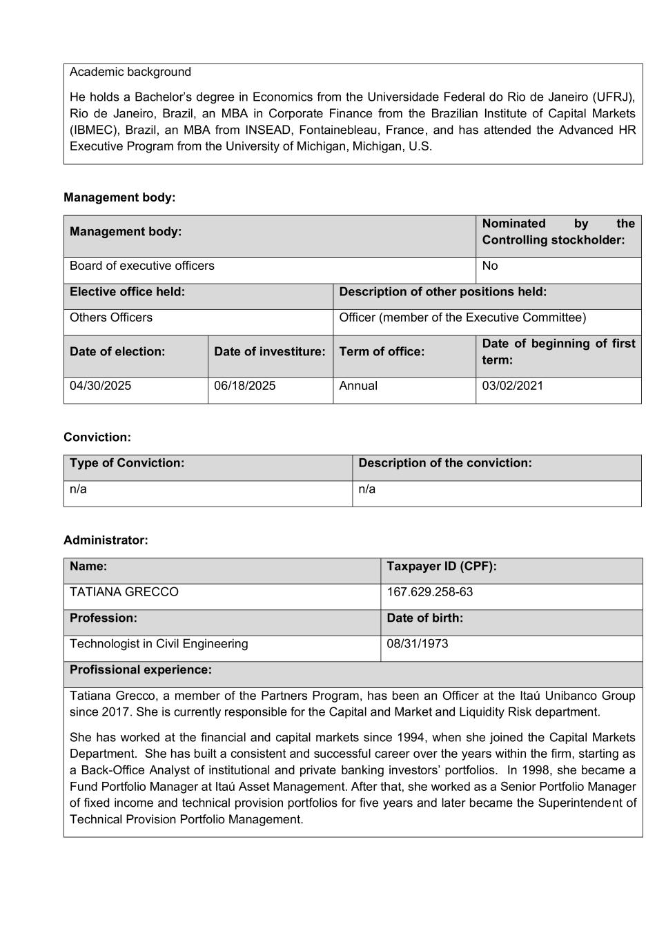 Academic background He holds a Bachelor’s degree in Economics from the Universidade Federal do Rio de Janeiro (UFRJ), Rio de Janeiro, Brazil, an MBA in Corporate Finance from the Brazilian Institute of Capital Markets (IBMEC), Brazil, an MBA from INSEAD, Fontainebleau, France, and has attended the Advanced HR Executive Program from the University of Michigan, Michigan, U.S. Management body: Management body: Nominated by the Controlling stockholder: Board of executive officers No Elective office held: Description of other positions held: Others Officers Officer (member of the Executive Committee) Date of election: Date of investiture: Term of office: Date of beginning of first term: 04/30/2025 06/18/2025 Annual 03/02/2021 Conviction: Type of Conviction: Description of the conviction: n/a n/a Administrator: Name: Taxpayer ID (CPF): TATIANA GRECCO 167.629.258-63 Profession: Date of birth: Technologist in Civil Engineering 08/31/1973 Profissional experience: Tatiana Grecco, a member of the Partners Program, has been an Officer at the Itaú Unibanco Group since 2017. She is currently responsible for the Capital and Market and Liquidity Risk department. She has worked at the financial and capital markets since 1994, when she joined the Capital Markets Department. She has built a consistent and successful career over the years within the firm, starting as a Back-Office Analyst of institutional and private banking investors’ portfolios. In 1998, she became a Fund Portfolio Manager at Itaú Asset Management. After that, she worked as a Senior Portfolio Manager of fixed income and technical provision portfolios for five years and later became the Superintendent of Technical Provision Portfolio Management.