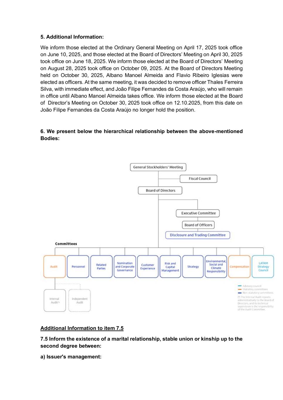 5. Additional Information: We inform those elected at the Ordinary General Meeting on April 17, 2025 took office on June 10, 2025, and those elected at the Board of Directors’ Meeting on April 30, 2025 took office on June 18, 2025. We inform those elected at the Board of Directors’ Meeting on August 28, 2025 took office on October 09, 2025. At the Board of Directors Meeting held on October 30, 2025, Albano Manoel Almeida and Flavio Ribeiro Iglesias were elected as officers. At the same meeting, it was decided to remove officer Thales Ferreira Silva, with immediate effect, and João Filipe Fernandes da Costa Araújo, who will remain in office until Albano Manoel Almeida takes office. We inform those elected at the Board of Director’s Meeting on October 30, 2025 took office on 12.10.2025, from this date on João Filipe Fernandes da Costa Araújo no longer hold the position. 6. We present below the hierarchical relationship between the above-mentioned Bodies: Additional Information to item 7.5 7.5 Inform the existence of a marital relationship, stable union or kinship up to the second degree between: a) Issuer's management: