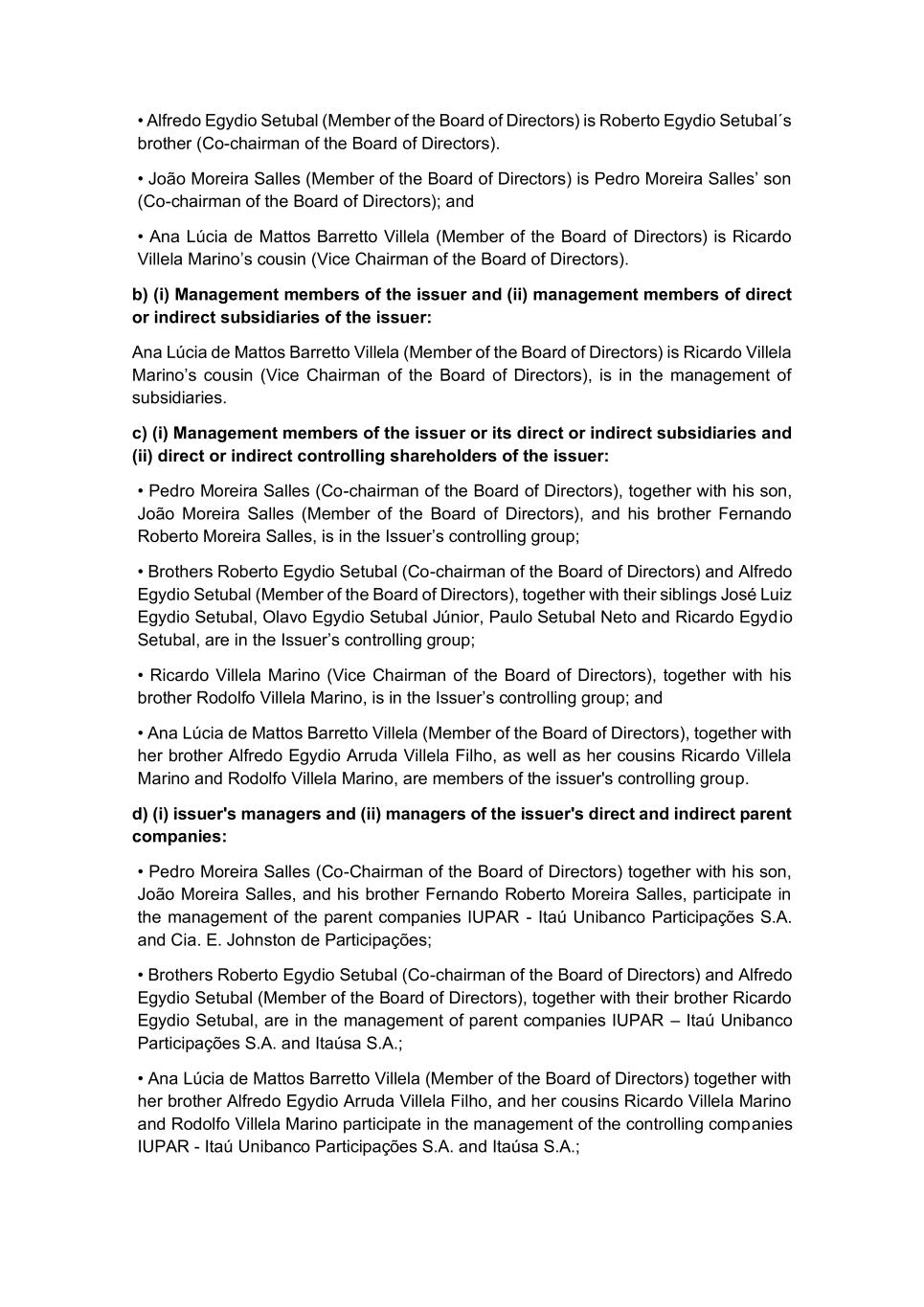 • Alfredo Egydio Setubal (Member of the Board of Directors) is Roberto Egydio Setubal´s brother (Co-chairman of the Board of Directors). • João Moreira Salles (Member of the Board of Directors) is Pedro Moreira Salles’ son (Co-chairman of the Board of Directors); and • Ana Lúcia de Mattos Barretto Villela (Member of the Board of Directors) is Ricardo Villela Marino’s cousin (Vice Chairman of the Board of Directors). b) (i) Management members of the issuer and (ii) management members of direct or indirect subsidiaries of the issuer: Ana Lúcia de Mattos Barretto Villela (Member of the Board of Directors) is Ricardo Villela Marino’s cousin (Vice Chairman of the Board of Directors), is in the management of subsidiaries. c) (i) Management members of the issuer or its direct or indirect subsidiaries and (ii) direct or indirect controlling shareholders of the issuer: • Pedro Moreira Salles (Co-chairman of the Board of Directors), together with his son, João Moreira Salles (Member of the Board of Directors), and his brother Fernando Roberto Moreira Salles, is in the Issuer’s controlling group; • Brothers Roberto Egydio Setubal (Co-chairman of the Board of Directors) and Alfredo Egydio Setubal (Member of the Board of Directors), together with their siblings José Luiz Egydio Setubal, Olavo Egydio Setubal Júnior, Paulo Setubal Neto and Ricardo Egydio Setubal, are in the Issuer’s controlling group; • Ricardo Villela Marino (Vice Chairman of the Board of Directors), together with his brother Rodolfo Villela Marino, is in the Issuer’s controlling group; and • Ana Lúcia de Mattos Barretto Villela (Member of the Board of Directors), together with her brother Alfredo Egydio Arruda Villela Filho, as well as her cousins Ricardo Villela Marino and Rodolfo Villela Marino, are members of the issuer's controlling group. d) (i) issuer's managers and (ii) managers of the issuer's direct and indirect parent companies: • Pedro Moreira Salles (Co-Chairman of the Board of Directors) together with his son, João Moreira Salles, and his brother Fernando Roberto Moreira Salles, participate in the management of the parent companies IUPAR - Itaú Unibanco Participações S.A. and Cia. E. Johnston de Participações; • Brothers Roberto Egydio Setubal (Co-chairman of the Board of Directors) and Alfredo Egydio Setubal (Member of the Board of Directors), together with their brother Ricardo Egydio Setubal, are in the management of parent companies IUPAR – Itaú Unibanco Participações S.A. and Itaúsa S.A.; • Ana Lúcia de Mattos Barretto Villela (Member of the Board of Directors) together with her brother Alfredo Egydio Arruda Villela Filho, and her cousins Ricardo Villela Marino and Rodolfo Villela Marino participate in the management of the controlling companies IUPAR - Itaú Unibanco Participações S.A. and Itaúsa S.A.;