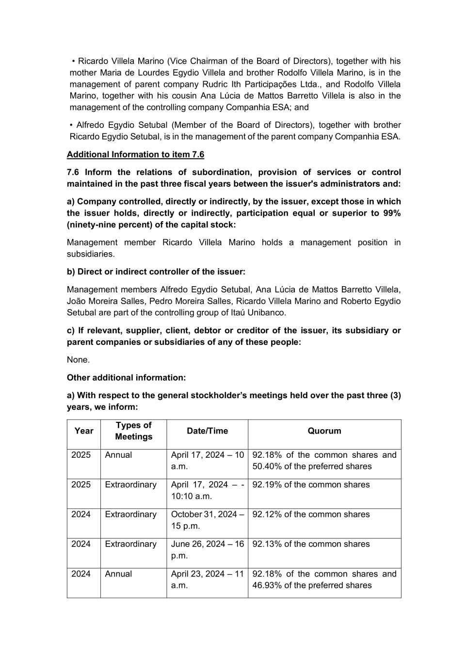 • Ricardo Villela Marino (Vice Chairman of the Board of Directors), together with his mother Maria de Lourdes Egydio Villela and brother Rodolfo Villela Marino, is in the management of parent company Rudric Ith Participações Ltda., and Rodolfo Villela Marino, together with his cousin Ana Lúcia de Mattos Barretto Villela is also in the management of the controlling company Companhia ESA; and • Alfredo Egydio Setubal (Member of the Board of Directors), together with brother Ricardo Egydio Setubal, is in the management of the parent company Companhia ESA. Additional Information to item 7.6 7.6 Inform the relations of subordination, provision of services or control maintained in the past three fiscal years between the issuer's administrators and: a) Company controlled, directly or indirectly, by the issuer, except those in which the issuer holds, directly or indirectly, participation equal or superior to 99% (ninety-nine percent) of the capital stock: Management member Ricardo Villela Marino holds a management position in subsidiaries. b) Direct or indirect controller of the issuer: Management members Alfredo Egydio Setubal, Ana Lúcia de Mattos Barretto Villela, João Moreira Salles, Pedro Moreira Salles, Ricardo Villela Marino and Roberto Egydio Setubal are part of the controlling group of Itaú Unibanco. c) If relevant, supplier, client, debtor or creditor of the issuer, its subsidiary or parent companies or subsidiaries of any of these people: None. Other additional information: a) With respect to the general stockholder’s meetings held over the past three (3) years, we inform: Year Types of Meetings Date/Time Quorum 2025 Annual April 17, 2024 – 10 a.m. 92.18% of the common shares and 50.40% of the preferred shares 2025 Extraordinary April 17, 2024 – - 10:10 a.m. 92.19% of the common shares 2024 Extraordinary October 31, 2024 – 15 p.m. 92.12% of the common shares 2024 Extraordinary June 26, 2024 – 16 p.m. 92.13% of the common shares 2024 Annual April 23, 2024 – 11 a.m. 92.18% of the common shares and 46.93% of the preferred shares