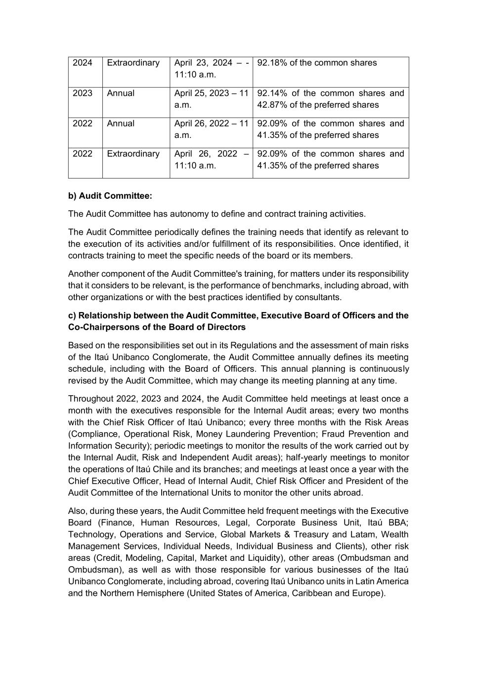 2024 Extraordinary April 23, 2024 – - 11:10 a.m. 92.18% of the common shares 2023 Annual April 25, 2023 – 11 a.m. 92.14% of the common shares and 42.87% of the preferred shares 2022 Annual April 26, 2022 – 11 a.m. 92.09% of the common shares and 41.35% of the preferred shares 2022 Extraordinary April 26, 2022 – 11:10 a.m. 92.09% of the common shares and 41.35% of the preferred shares b) Audit Committee: The Audit Committee has autonomy to define and contract training activities. The Audit Committee periodically defines the training needs that identify as relevant to the execution of its activities and/or fulfillment of its responsibilities. Once identified, it contracts training to meet the specific needs of the board or its members. Another component of the Audit Committee's training, for matters under its responsibility that it considers to be relevant, is the performance of benchmarks, including abroad, with other organizations or with the best practices identified by consultants. c) Relationship between the Audit Committee, Executive Board of Officers and the Co-Chairpersons of the Board of Directors Based on the responsibilities set out in its Regulations and the assessment of main risks of the Itaú Unibanco Conglomerate, the Audit Committee annually defines its meeting schedule, including with the Board of Officers. This annual planning is continuously revised by the Audit Committee, which may change its meeting planning at any time. Throughout 2022, 2023 and 2024, the Audit Committee held meetings at least once a month with the executives responsible for the Internal Audit areas; every two months with the Chief Risk Officer of Itaú Unibanco; every three months with the Risk Areas (Compliance, Operational Risk, Money Laundering Prevention; Fraud Prevention and Information Security); periodic meetings to monitor the results of the work carried out by the Internal Audit, Risk and Independent Audit areas); half-yearly meetings to monitor the operations of Itaú Chile and its branches; and meetings at least once a year with the Chief Executive Officer, Head of Internal Audit, Chief Risk Officer and President of the Audit Committee of the International Units to monitor the other units abroad. Also, during these years, the Audit Committee held frequent meetings with the Executive Board (Finance, Human Resources, Legal, Corporate Business Unit, Itaú BBA; Technology, Operations and Service, Global Markets & Treasury and Latam, Wealth Management Services, Individual Needs, Individual Business and Clients), other risk areas (Credit, Modeling, Capital, Market and Liquidity), other areas (Ombudsman and Ombudsman), as well as with those responsible for various businesses of the Itaú Unibanco Conglomerate, including abroad, covering Itaú Unibanco units in Latin America and the Northern Hemisphere (United States of America, Caribbean and Europe).