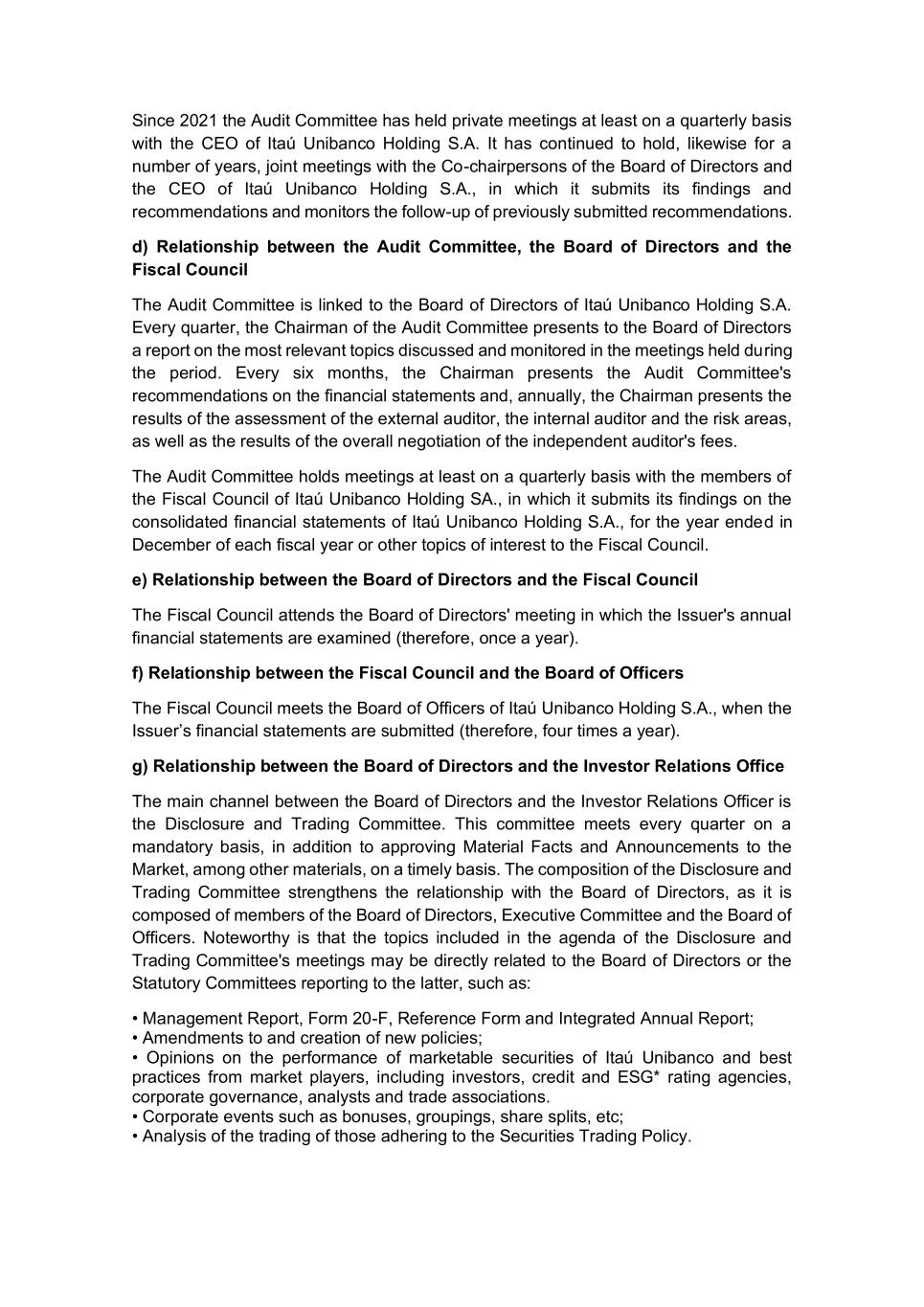 Since 2021 the Audit Committee has held private meetings at least on a quarterly basis with the CEO of Itaú Unibanco Holding S.A. It has continued to hold, likewise for a number of years, joint meetings with the Co-chairpersons of the Board of Directors and the CEO of Itaú Unibanco Holding S.A., in which it submits its findings and recommendations and monitors the follow-up of previously submitted recommendations. d) Relationship between the Audit Committee, the Board of Directors and the Fiscal Council The Audit Committee is linked to the Board of Directors of Itaú Unibanco Holding S.A. Every quarter, the Chairman of the Audit Committee presents to the Board of Directors a report on the most relevant topics discussed and monitored in the meetings held during the period. Every six months, the Chairman presents the Audit Committee's recommendations on the financial statements and, annually, the Chairman presents the results of the assessment of the external auditor, the internal auditor and the risk areas, as well as the results of the overall negotiation of the independent auditor's fees. The Audit Committee holds meetings at least on a quarterly basis with the members of the Fiscal Council of Itaú Unibanco Holding SA., in which it submits its findings on the consolidated financial statements of Itaú Unibanco Holding S.A., for the year ended in December of each fiscal year or other topics of interest to the Fiscal Council. e) Relationship between the Board of Directors and the Fiscal Council The Fiscal Council attends the Board of Directors' meeting in which the Issuer's annual financial statements are examined (therefore, once a year). f) Relationship between the Fiscal Council and the Board of Officers The Fiscal Council meets the Board of Officers of Itaú Unibanco Holding S.A., when the Issuer’s financial statements are submitted (therefore, four times a year). g) Relationship between the Board of Directors and the Investor Relations Office The main channel between the Board of Directors and the Investor Relations Officer is the Disclosure and Trading Committee. This committee meets every quarter on a mandatory basis, in addition to approving Material Facts and Announcements to the Market, among other materials, on a timely basis. The composition of the Disclosure and Trading Committee strengthens the relationship with the Board of Directors, as it is composed of members of the Board of Directors, Executive Committee and the Board of Officers. Noteworthy is that the topics included in the agenda of the Disclosure and Trading Committee's meetings may be directly related to the Board of Directors or the Statutory Committees reporting to the latter, such as: • Management Report, Form 20-F, Reference Form and Integrated Annual Report; • Amendments to and creation of new policies; • Opinions on the performance of marketable securities of Itaú Unibanco and best practices from market players, including investors, credit and ESG* rating agencies, corporate governance, analysts and trade associations. • Corporate events such as bonuses, groupings, share splits, etc; • Analysis of the trading of those adhering to the Securities Trading Policy.