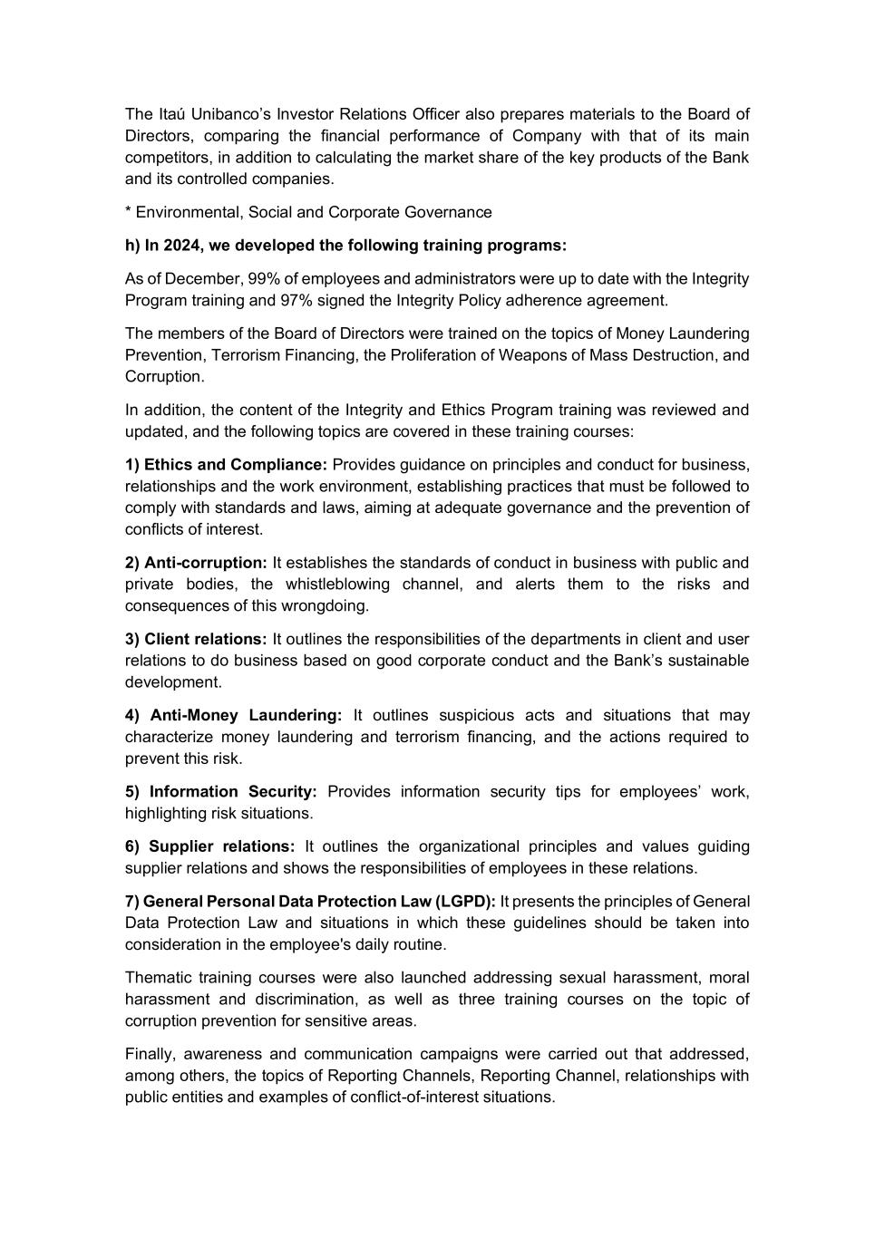 The Itaú Unibanco’s Investor Relations Officer also prepares materials to the Board of Directors, comparing the financial performance of Company with that of its main competitors, in addition to calculating the market share of the key products of the Bank and its controlled companies. * Environmental, Social and Corporate Governance h) In 2024, we developed the following training programs: As of December, 99% of employees and administrators were up to date with the Integrity Program training and 97% signed the Integrity Policy adherence agreement. The members of the Board of Directors were trained on the topics of Money Laundering Prevention, Terrorism Financing, the Proliferation of Weapons of Mass Destruction, and Corruption. In addition, the content of the Integrity and Ethics Program training was reviewed and updated, and the following topics are covered in these training courses: 1) Ethics and Compliance: Provides guidance on principles and conduct for business, relationships and the work environment, establishing practices that must be followed to comply with standards and laws, aiming at adequate governance and the prevention of conflicts of interest. 2) Anti-corruption: It establishes the standards of conduct in business with public and private bodies, the whistleblowing channel, and alerts them to the risks and consequences of this wrongdoing. 3) Client relations: It outlines the responsibilities of the departments in client and user relations to do business based on good corporate conduct and the Bank’s sustainable development. 4) Anti-Money Laundering: It outlines suspicious acts and situations that may characterize money laundering and terrorism financing, and the actions required to prevent this risk. 5) Information Security: Provides information security tips for employees’ work, highlighting risk situations. 6) Supplier relations: It outlines the organizational principles and values guiding supplier relations and shows the responsibilities of employees in these relations. 7) General Personal Data Protection Law (LGPD): It presents the principles of General Data Protection Law and situations in which these guidelines should be taken into consideration in the employee's daily routine. Thematic training courses were also launched addressing sexual harassment, moral harassment and discrimination, as well as three training courses on the topic of corruption prevention for sensitive areas. Finally, awareness and communication campaigns were carried out that addressed, among others, the topics of Reporting Channels, Reporting Channel, relationships with public entities and examples of conflict-of-interest situations.