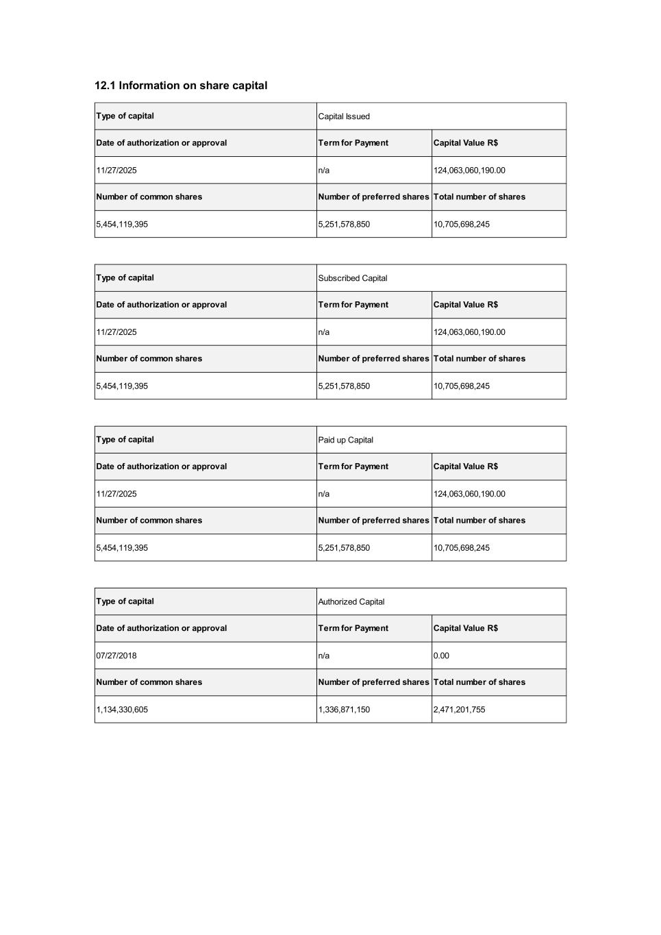 12.1 Information on share capital 11/27/2025 n/a 124,063,060,190.00 5,454,119,395 5,251,578,850 10,705,698,245 11/27/2025 n/a 124,063,060,190.00 5,454,119,395 5,251,578,850 10,705,698,245 11/27/2025 n/a 124,063,060,190.00 5,454,119,395 5,251,578,850 10,705,698,245 07/27/2018 n/a 0.00 1,134,330,605 1,336,871,150 2,471,201,755 Date of authorization or approval Term for Payment Capital Value R$ Number of common shares Number of preferred shares Total number of shares Number of common shares Number of preferred shares Total number of shares Type of capital Authorized Capital Type of capital Paid up Capital Date of authorization or approval Term for Payment Capital Value R$ Date of authorization or approval Term for Payment Capital Value R$ Number of common shares Number of preferred shares Total number of shares Total number of shares Capital Issued Capital Value R$ Type of capital Subscribed Capital Date of authorization or approval Term for Payment Number of common shares Number of preferred shares Type of capital