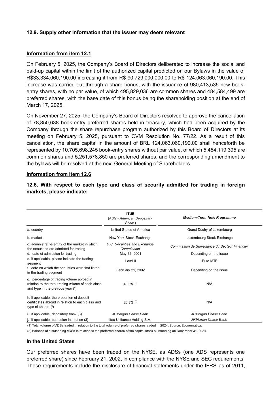 12.9. Supply other information that the issuer may deem relevant Information from item 12.1 On February 5, 2025, the Company’s Board of Directors deliberated to increase the social and paid-up capital within the limit of the authorized capital predicted on our Bylaws in the value of R$33,334,060,190.00 increasing it from R$ 90,729,000,000.00 to R$ 124,063,060,190.00. This increase was carried out through a share bonus, with the issuance of 980,413,535 new book- entry shares, with no par value, of which 495,829,036 are common shares and 484,584,499 are preferred shares, with the base date of this bonus being the shareholding position at the end of March 17, 2025. On November 27, 2025, the Company’s Board of Directors resolved to approve the cancellation of 78,850,638 book-entry preferred shares held in treasury, which had been acquired by the Company through the share repurchase program authorized by this Board of Directors at its meeting on February 5, 2025, pursuant to CVM Resolution No. 77/22. As a result of this cancellation, the share capital in the amount of BRL 124,063,060,190.00 shall henceforth be represented by 10,705,698,245 book-entry shares without par value, of which 5,454,119,395 are common shares and 5,251,578,850 are preferred shares, and the corresponding amendment to the bylaws will be resolved at the next General Meeting of Shareholders. Information from item 12.6 12.6. With respect to each type and class of security admitted for trading in foreign markets, please indicate: In the United States Our preferred shares have been traded on the NYSE, as ADSs (one ADS represents one preferred share) since February 21, 2002, in compliance with the NYSE and SEC requirements. These requirements include the disclosure of financial statements under the IFRS as of 2011, ITUB (ADS - American Depositary Share ) a. country United States of America b. market New York Stock Exchange c. administrative entity of the market in which the securities are admitted for trading U.S. Securities and Exchange Commission d.  date of admission for trading May 31, 2001 e. if applicable, please indicate the trading segment Level II f.  date on which the securities were first listed in the trading segment February 21, 2002 g.  percentage of trading volume abroad in relation to the total trading volume of each class and type in the previous year (¹) 48.3% (¹) h. if applicable, the proportion of deposit certificates abroad in relation to each class and type of shares (²) 20.3% (²) i.  if applicable, depository bank (3) JPMorgan Chase Bank j.  if applicable, custodian institution (3) Itaú Unibanco Holding S.A. (1) Total volume of ADSs traded in relation to the total volume of preferred shares traded in 2024. Source: Economática. (2) Balance of outstanding ADSs in relation to the preferred shares of the capital stock outstanding on December 31, 2024. Medium-Term Note Programme Euro MTF Depending on the issue N/A N/A JPMorgan Chase Bank JPMorgan Chase Bank Grand Duchy of Luxembourg Luxembourg Stock Exchange Commission de Surveillance du Secteur Financier Depending on the issue