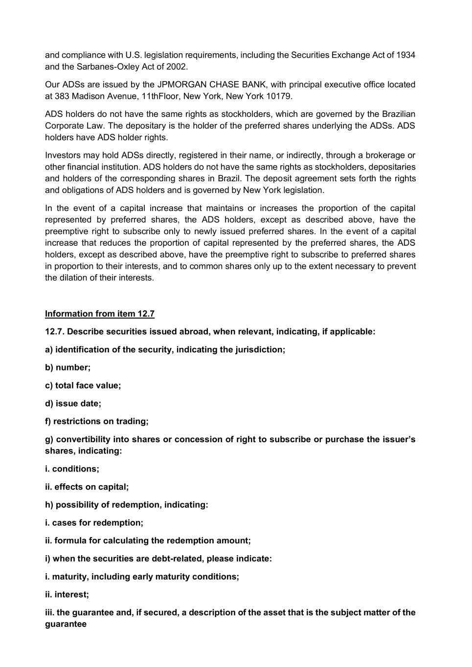 and compliance with U.S. legislation requirements, including the Securities Exchange Act of 1934 and the Sarbanes-Oxley Act of 2002. Our ADSs are issued by the JPMORGAN CHASE BANK, with principal executive office located at 383 Madison Avenue, 11thFloor, New York, New York 10179. ADS holders do not have the same rights as stockholders, which are governed by the Brazilian Corporate Law. The depositary is the holder of the preferred shares underlying the ADSs. ADS holders have ADS holder rights. Investors may hold ADSs directly, registered in their name, or indirectly, through a brokerage or other financial institution. ADS holders do not have the same rights as stockholders, depositaries and holders of the corresponding shares in Brazil. The deposit agreement sets forth the rights and obligations of ADS holders and is governed by New York legislation. In the event of a capital increase that maintains or increases the proportion of the capital represented by preferred shares, the ADS holders, except as described above, have the preemptive right to subscribe only to newly issued preferred shares. In the event of a capital increase that reduces the proportion of capital represented by the preferred shares, the ADS holders, except as described above, have the preemptive right to subscribe to preferred shares in proportion to their interests, and to common shares only up to the extent necessary to prevent the dilation of their interests. Information from item 12.7 12.7. Describe securities issued abroad, when relevant, indicating, if applicable: a) identification of the security, indicating the jurisdiction; b) number; c) total face value; d) issue date; f) restrictions on trading; g) convertibility into shares or concession of right to subscribe or purchase the issuer’s shares, indicating: i. conditions; ii. effects on capital; h) possibility of redemption, indicating: i. cases for redemption; ii. formula for calculating the redemption amount; i) when the securities are debt-related, please indicate: i. maturity, including early maturity conditions; ii. interest; iii. the guarantee and, if secured, a description of the asset that is the subject matter of the guarantee