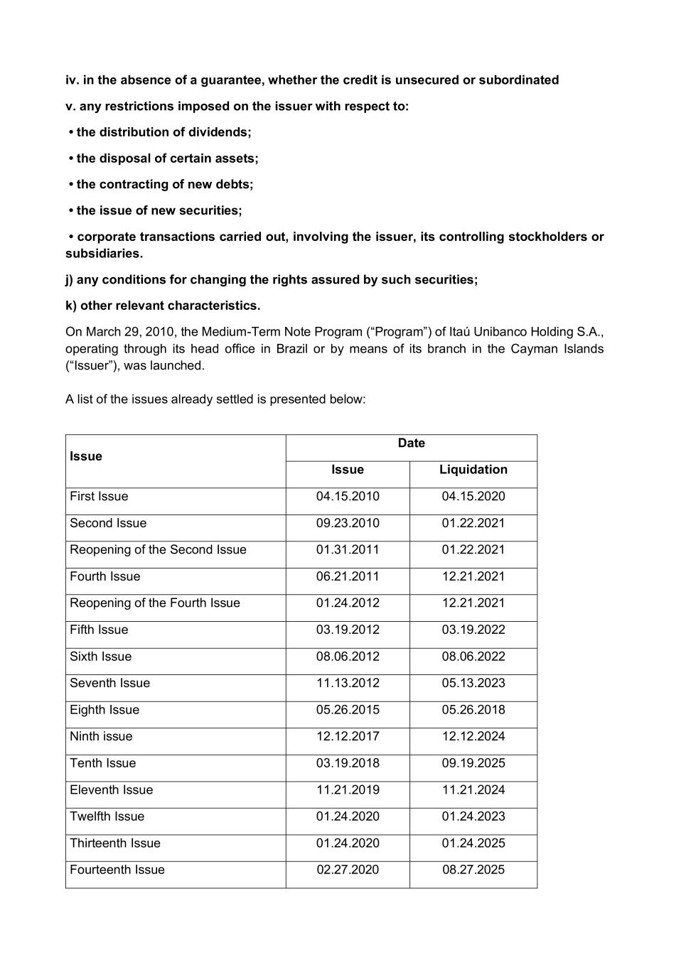 iv. in the absence of a guarantee, whether the credit is unsecured or subordinated v. any restrictions imposed on the issuer with respect to: • the distribution of dividends; • the disposal of certain assets; • the contracting of new debts; • the issue of new securities; • corporate transactions carried out, involving the issuer, its controlling stockholders or subsidiaries. j) any conditions for changing the rights assured by such securities; k) other relevant characteristics. On March 29, 2010, the Medium-Term Note Program (“Program”) of Itaú Unibanco Holding S.A., operating through its head office in Brazil or by means of its branch in the Cayman Islands (“Issuer”), was launched. A list of the issues already settled is presented below: Issue Date Issue Liquidation First Issue 04.15.2010 04.15.2020 Second Issue 09.23.2010 01.22.2021 Reopening of the Second Issue 01.31.2011 01.22.2021 Fourth Issue 06.21.2011 12.21.2021 Reopening of the Fourth Issue 01.24.2012 12.21.2021 Fifth Issue 03.19.2012 03.19.2022 Sixth Issue 08.06.2012 08.06.2022 Seventh Issue 11.13.2012 05.13.2023 Eighth Issue 05.26.2015 05.26.2018 Ninth issue 12.12.2017 12.12.2024 Tenth Issue 03.19.2018 09.19.2025 Eleventh Issue 11.21.2019 11.21.2024 Twelfth Issue 01.24.2020 01.24.2023 Thirteenth Issue 01.24.2020 01.24.2025 Fourteenth Issue 02.27.2020 08.27.2025