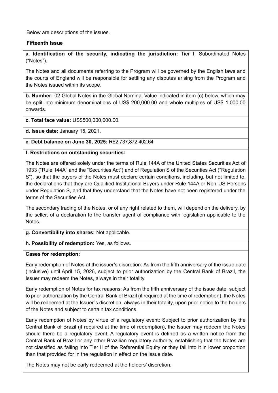 Below are descriptions of the issues. Fifteenth Issue a. Identification of the security, indicating the jurisdiction: Tier II Subordinated Notes (“Notes”). The Notes and all documents referring to the Program will be governed by the English laws and the courts of England will be responsible for settling any disputes arising from the Program and the Notes issued within its scope. b. Number: 02 Global Notes in the Global Nominal Value indicated in item (c) below, which may be split into minimum denominations of US$ 200,000.00 and whole multiples of US$ 1,000.00 onwards. c. Total face value: US$500,000,000.00. d. Issue date: January 15, 2021. e. Debt balance on June 30, 2025: R$2,737,872,402.64 f. Restrictions on outstanding securities: The Notes are offered solely under the terms of Rule 144A of the United States Securities Act of 1933 (“Rule 144A” and the “Securities Act”) and of Regulation S of the Securities Act (“Regulation S”), so that the buyers of the Notes must declare certain conditions, including, but not limited to, the declarations that they are Qualified Institutional Buyers under Rule 144A or Non-US Persons under Regulation S, and that they understand that the Notes have not been registered under the terms of the Securities Act. The secondary trading of the Notes, or of any right related to them, will depend on the delivery, by the seller, of a declaration to the transfer agent of compliance with legislation applicable to the Notes. g. Convertibility into shares: Not applicable. h. Possibility of redemption: Yes, as follows. Cases for redemption: Early redemption of Notes at the issuer’s discretion: As from the fifth anniversary of the issue date (inclusive) until April 15, 2026, subject to prior authorization by the Central Bank of Brazil, the Issuer may redeem the Notes, always in their totality. Early redemption of Notes for tax reasons: As from the fifth anniversary of the issue date, subject to prior authorization by the Central Bank of Brazil (if required at the time of redemption), the Notes will be redeemed at the Issuer`s discretion, always in their totality, upon prior notice to the holders of the Notes and subject to certain tax conditions. Early redemption of Notes by virtue of a regulatory event: Subject to prior authorization by the Central Bank of Brazil (if required at the time of redemption), the Issuer may redeem the Notes should there be a regulatory event. A regulatory event is defined as a written notice from the Central Bank of Brazil or any other Brazilian regulatory authority, establishing that the Notes are not classified as falling into Tier II of the Referential Equity or they fall into it in lower proportion than that provided for in the regulation in effect on the issue date. The Notes may not be early redeemed at the holders’ discretion.