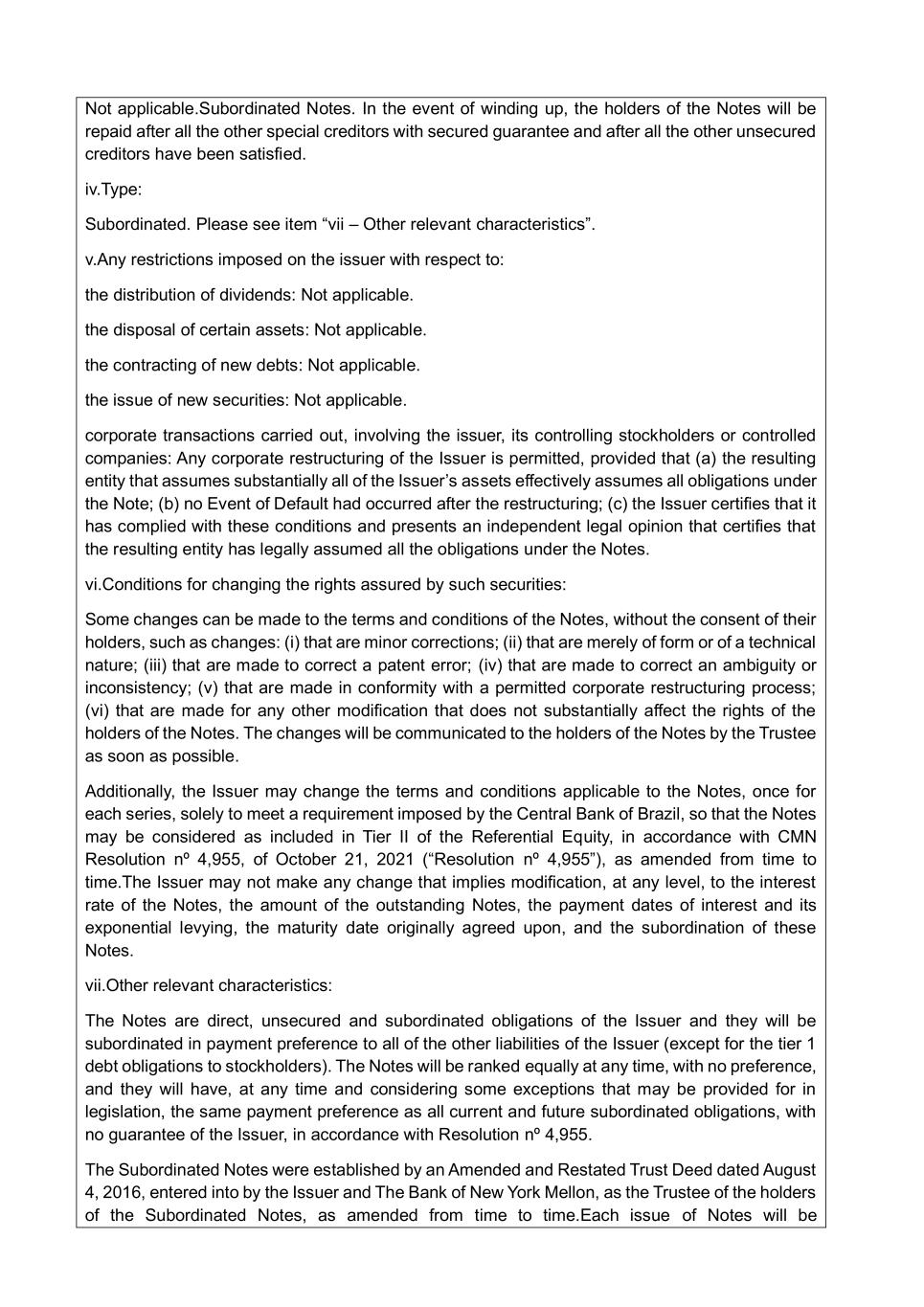 Not applicable.Subordinated Notes. In the event of winding up, the holders of the Notes will be repaid after all the other special creditors with secured guarantee and after all the other unsecured creditors have been satisfied. iv.Type: Subordinated. Please see item “vii – Other relevant characteristics”. v.Any restrictions imposed on the issuer with respect to: the distribution of dividends: Not applicable. the disposal of certain assets: Not applicable. the contracting of new debts: Not applicable. the issue of new securities: Not applicable. corporate transactions carried out, involving the issuer, its controlling stockholders or controlled companies: Any corporate restructuring of the Issuer is permitted, provided that (a) the resulting entity that assumes substantially all of the Issuer’s assets effectively assumes all obligations under the Note; (b) no Event of Default had occurred after the restructuring; (c) the Issuer certifies that it has complied with these conditions and presents an independent legal opinion that certifies that the resulting entity has legally assumed all the obligations under the Notes. vi.Conditions for changing the rights assured by such securities: Some changes can be made to the terms and conditions of the Notes, without the consent of their holders, such as changes: (i) that are minor corrections; (ii) that are merely of form or of a technical nature; (iii) that are made to correct a patent error; (iv) that are made to correct an ambiguity or inconsistency; (v) that are made in conformity with a permitted corporate restructuring process; (vi) that are made for any other modification that does not substantially affect the rights of the holders of the Notes. The changes will be communicated to the holders of the Notes by the Trustee as soon as possible. Additionally, the Issuer may change the terms and conditions applicable to the Notes, once for each series, solely to meet a requirement imposed by the Central Bank of Brazil, so that the Notes may be considered as included in Tier II of the Referential Equity, in accordance with CMN Resolution nº 4,955, of October 21, 2021 (“Resolution nº 4,955”), as amended from time to time.The Issuer may not make any change that implies modification, at any level, to the interest rate of the Notes, the amount of the outstanding Notes, the payment dates of interest and its exponential levying, the maturity date originally agreed upon, and the subordination of these Notes. vii.Other relevant characteristics: The Notes are direct, unsecured and subordinated obligations of the Issuer and they will be subordinated in payment preference to all of the other liabilities of the Issuer (except for the tier 1 debt obligations to stockholders). The Notes will be ranked equally at any time, with no preference, and they will have, at any time and considering some exceptions that may be provided for in legislation, the same payment preference as all current and future subordinated obligations, with no guarantee of the Issuer, in accordance with Resolution nº 4,955. The Subordinated Notes were established by an Amended and Restated Trust Deed dated August 4, 2016, entered into by the Issuer and The Bank of New York Mellon, as the Trustee of the holders of the Subordinated Notes, as amended from time to time.Each issue of Notes will be