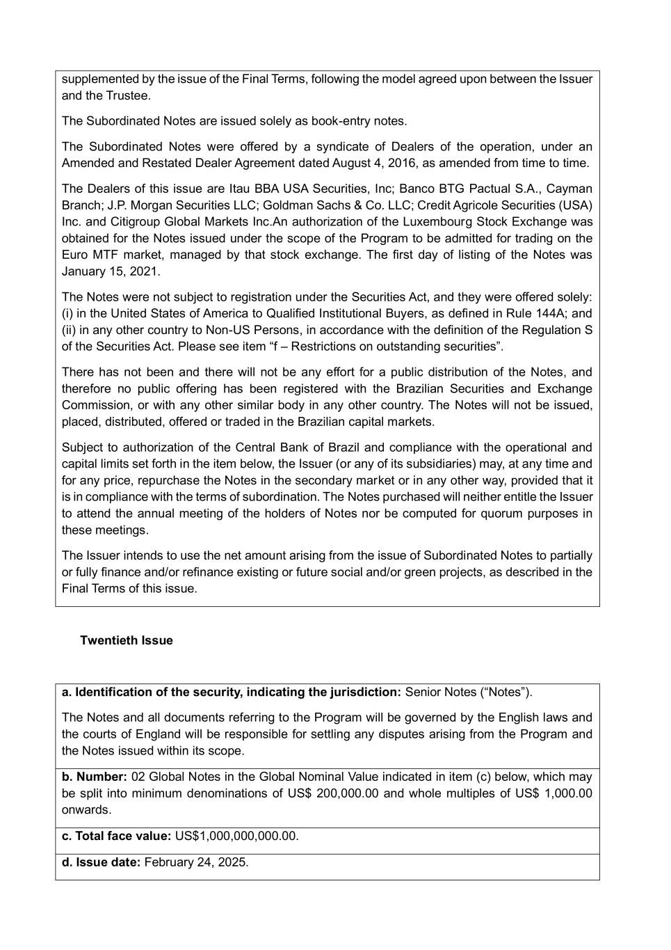 supplemented by the issue of the Final Terms, following the model agreed upon between the Issuer and the Trustee. The Subordinated Notes are issued solely as book-entry notes. The Subordinated Notes were offered by a syndicate of Dealers of the operation, under an Amended and Restated Dealer Agreement dated August 4, 2016, as amended from time to time. The Dealers of this issue are Itau BBA USA Securities, Inc; Banco BTG Pactual S.A., Cayman Branch; J.P. Morgan Securities LLC; Goldman Sachs & Co. LLC; Credit Agricole Securities (USA) Inc. and Citigroup Global Markets Inc.An authorization of the Luxembourg Stock Exchange was obtained for the Notes issued under the scope of the Program to be admitted for trading on the Euro MTF market, managed by that stock exchange. The first day of listing of the Notes was January 15, 2021. The Notes were not subject to registration under the Securities Act, and they were offered solely: (i) in the United States of America to Qualified Institutional Buyers, as defined in Rule 144A; and (ii) in any other country to Non-US Persons, in accordance with the definition of the Regulation S of the Securities Act. Please see item “f – Restrictions on outstanding securities”. There has not been and there will not be any effort for a public distribution of the Notes, and therefore no public offering has been registered with the Brazilian Securities and Exchange Commission, or with any other similar body in any other country. The Notes will not be issued, placed, distributed, offered or traded in the Brazilian capital markets. Subject to authorization of the Central Bank of Brazil and compliance with the operational and capital limits set forth in the item below, the Issuer (or any of its subsidiaries) may, at any time and for any price, repurchase the Notes in the secondary market or in any other way, provided that it is in compliance with the terms of subordination. The Notes purchased will neither entitle the Issuer to attend the annual meeting of the holders of Notes nor be computed for quorum purposes in these meetings. The Issuer intends to use the net amount arising from the issue of Subordinated Notes to partially or fully finance and/or refinance existing or future social and/or green projects, as described in the Final Terms of this issue. Twentieth Issue a. Identification of the security, indicating the jurisdiction: Senior Notes (“Notes”). The Notes and all documents referring to the Program will be governed by the English laws and the courts of England will be responsible for settling any disputes arising from the Program and the Notes issued within its scope. b. Number: 02 Global Notes in the Global Nominal Value indicated in item (c) below, which may be split into minimum denominations of US$ 200,000.00 and whole multiples of US$ 1,000.00 onwards. c. Total face value: US$1,000,000,000.00. d. Issue date: February 24, 2025.