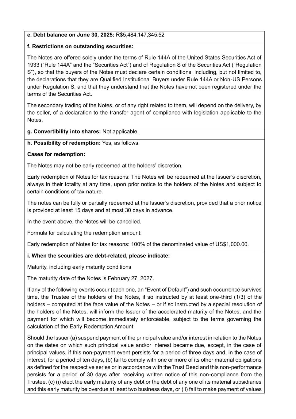 e. Debt balance on June 30, 2025: R$5,484,147,345.52 f. Restrictions on outstanding securities: The Notes are offered solely under the terms of Rule 144A of the United States Securities Act of 1933 (“Rule 144A” and the “Securities Act”) and of Regulation S of the Securities Act (“Regulation S”), so that the buyers of the Notes must declare certain conditions, including, but not limited to, the declarations that they are Qualified Institutional Buyers under Rule 144A or Non-US Persons under Regulation S, and that they understand that the Notes have not been registered under the terms of the Securities Act. The secondary trading of the Notes, or of any right related to them, will depend on the delivery, by the seller, of a declaration to the transfer agent of compliance with legislation applicable to the Notes. g. Convertibility into shares: Not applicable. h. Possibility of redemption: Yes, as follows. Cases for redemption: The Notes may not be early redeemed at the holders’ discretion. Early redemption of Notes for tax reasons: The Notes will be redeemed at the Issuer’s discretion, always in their totality at any time, upon prior notice to the holders of the Notes and subject to certain conditions of tax nature. The notes can be fully or partially redeemed at the Issuer’s discretion, provided that a prior notice is provided at least 15 days and at most 30 days in advance. In the event above, the Notes will be cancelled. Formula for calculating the redemption amount: Early redemption of Notes for tax reasons: 100% of the denominated value of US$1,000.00. i. When the securities are debt-related, please indicate: Maturity, including early maturity conditions The maturity date of the Notes is February 27, 2027. If any of the following events occur (each one, an “Event of Default”) and such occurrence survives time, the Trustee of the holders of the Notes, if so instructed by at least one-third (1/3) of the holders – computed at the face value of the Notes – or if so instructed by a special resolution of the holders of the Notes, will inform the Issuer of the accelerated maturity of the Notes, and the payment for which will become immediately enforceable, subject to the terms governing the calculation of the Early Redemption Amount. Should the Issuer (a) suspend payment of the principal value and/or interest in relation to the Notes on the dates on which such principal value and/or interest became due, except, in the case of principal values, if this non-payment event persists for a period of three days and, in the case of interest, for a period of ten days, (b) fail to comply with one or more of its other material obligations as defined for the respective series or in accordance with the Trust Deed and this non-performance persists for a period of 30 days after receiving written notice of this non-compliance from the Trustee, (c) (i) elect the early maturity of any debt or the debt of any one of its material subsidiaries and this early maturity be overdue at least two business days, or (ii) fail to make payment of values