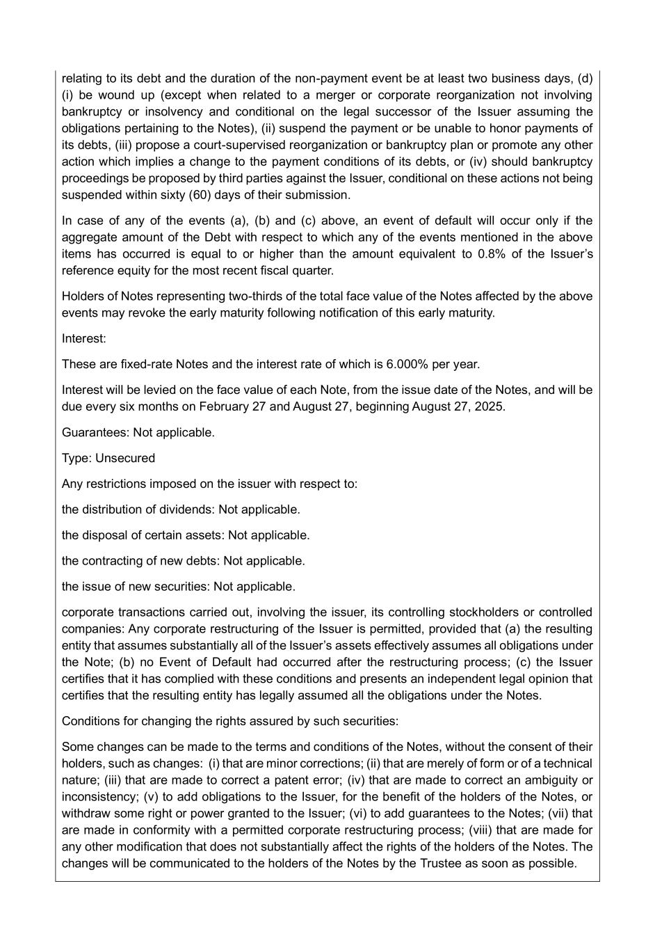 relating to its debt and the duration of the non-payment event be at least two business days, (d) (i) be wound up (except when related to a merger or corporate reorganization not involving bankruptcy or insolvency and conditional on the legal successor of the Issuer assuming the obligations pertaining to the Notes), (ii) suspend the payment or be unable to honor payments of its debts, (iii) propose a court-supervised reorganization or bankruptcy plan or promote any other action which implies a change to the payment conditions of its debts, or (iv) should bankruptcy proceedings be proposed by third parties against the Issuer, conditional on these actions not being suspended within sixty (60) days of their submission. In case of any of the events (a), (b) and (c) above, an event of default will occur only if the aggregate amount of the Debt with respect to which any of the events mentioned in the above items has occurred is equal to or higher than the amount equivalent to 0.8% of the Issuer’s reference equity for the most recent fiscal quarter. Holders of Notes representing two-thirds of the total face value of the Notes affected by the above events may revoke the early maturity following notification of this early maturity. Interest: These are fixed-rate Notes and the interest rate of which is 6.000% per year. Interest will be levied on the face value of each Note, from the issue date of the Notes, and will be due every six months on February 27 and August 27, beginning August 27, 2025. Guarantees: Not applicable. Type: Unsecured Any restrictions imposed on the issuer with respect to: the distribution of dividends: Not applicable. the disposal of certain assets: Not applicable. the contracting of new debts: Not applicable. the issue of new securities: Not applicable. corporate transactions carried out, involving the issuer, its controlling stockholders or controlled companies: Any corporate restructuring of the Issuer is permitted, provided that (a) the resulting entity that assumes substantially all of the Issuer’s assets effectively assumes all obligations under the Note; (b) no Event of Default had occurred after the restructuring process; (c) the Issuer certifies that it has complied with these conditions and presents an independent legal opinion that certifies that the resulting entity has legally assumed all the obligations under the Notes. Conditions for changing the rights assured by such securities: Some changes can be made to the terms and conditions of the Notes, without the consent of their holders, such as changes: (i) that are minor corrections; (ii) that are merely of form or of a technical nature; (iii) that are made to correct a patent error; (iv) that are made to correct an ambiguity or inconsistency; (v) to add obligations to the Issuer, for the benefit of the holders of the Notes, or withdraw some right or power granted to the Issuer; (vi) to add guarantees to the Notes; (vii) that are made in conformity with a permitted corporate restructuring process; (viii) that are made for any other modification that does not substantially affect the rights of the holders of the Notes. The changes will be communicated to the holders of the Notes by the Trustee as soon as possible.