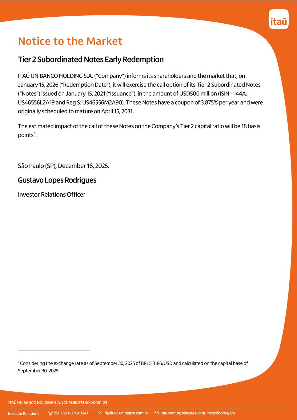 Notice to the Market Tier 2 Subordinated Notes Early Redemption ITAÚ UNIBANCO HOLDING S.A. (“Company”) informs its shareholders and the market that, on January 15, 2026 (“Redemption Date”), it will exercise the call option of its Tier 2 Subordinated Notes (“Notes”) issued on January 15, 2021 (“Issuance”), in the amount of USD500 million (ISIN - 144A: US46556L2A19 and Reg S: US46556M2A90). These Notes have a coupon of 3.875% per year and were originally scheduled to mature on April 15, 2031. The estimated impact of the call of these Notes on the Company’s Tier 2 capital ratio will be 18 basis points1. São Paulo (SP), December 16, 2025. Gustavo Lopes Rodrigues Investor Relations Officer 1 Considering the exchange rate as of September 30, 2025 of BRL5.3186/USD and calculated on the capital base of September 30, 2025.