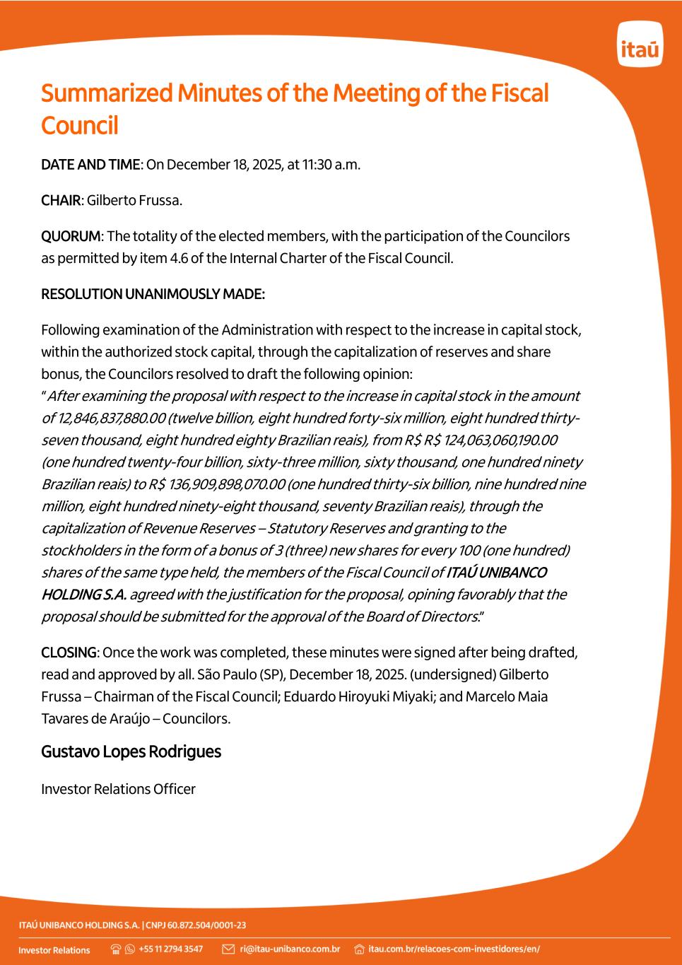 Summarized Minutes of the Meeting of the Fiscal Council DATE AND TIME: On December 18, 2025, at 11:30 a.m. CHAIR: Gilberto Frussa. QUORUM: The totality of the elected members, with the participation of the Councilors as permitted by item 4.6 of the Internal Charter of the Fiscal Council. RESOLUTION UNANIMOUSLY MADE: Following examination of the Administration with respect to the increase in capital stock, within the authorized stock capital, through the capitalization of reserves and share bonus, the Councilors resolved to draft the following opinion: “After examining the proposal with respect to the increase in capital stock in the amount of 12,846,837,880.00 (twelve billion, eight hundred forty-six million, eight hundred thirty- seven thousand, eight hundred eighty Brazilian reais), from R$ R$ 124,063,060,190.00 (one hundred twenty-four billion, sixty-three million, sixty thousand, one hundred ninety Brazilian reais) to R$ 136,909,898,070.00 (one hundred thirty-six billion, nine hundred nine million, eight hundred ninety-eight thousand, seventy Brazilian reais), through the capitalization of Revenue Reserves – Statutory Reserves and granting to the stockholders in the form of a bonus of 3 (three) new shares for every 100 (one hundred) shares of the same type held, the members of the Fiscal Council of ITAÚ UNIBANCO HOLDING S.A. agreed with the justification for the proposal, opining favorably that the proposal should be submitted for the approval of the Board of Directors.” CLOSING: Once the work was completed, these minutes were signed after being drafted, read and approved by all. São Paulo (SP), December 18, 2025. (undersigned) Gilberto Frussa – Chairman of the Fiscal Council; Eduardo Hiroyuki Miyaki; and Marcelo Maia Tavares de Araújo – Councilors. Gustavo Lopes Rodrigues Investor Relations Officer