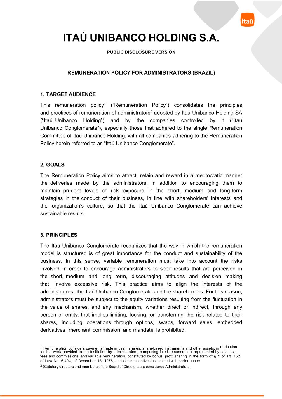 ITAÚ UNIBANCO HOLDING S.A. PUBLIC DISCLOSURE VERSION REMUNERATION POLICY FOR ADMINISTRATORS (BRAZIL) 1. TARGET AUDIENCE This remuneration policy1 (“Remuneration Policy”) consolidates the principles and practices of remuneration of administrators2 adopted by Itaú Unibanco Holding SA (“Itaú Unibanco Holding”) and by the companies controlled by it (“Itaú Unibanco Conglomerate”), especially those that adhered to the single Remuneration Committee of Itaú Unibanco Holding, with all companies adhering to the Remuneration Policy herein referred to as “Itaú Unibanco Conglomerate”. 2. GOALS The Remuneration Policy aims to attract, retain and reward in a meritocratic manner the deliveries made by the administrators, in addition to encouraging them to maintain prudent levels of risk exposure in the short, medium and long-term strategies in the conduct of their business, in line with shareholders' interests and the organization's culture, so that the Itaú Unibanco Conglomerate can achieve sustainable results. 3. PRINCIPLES The Itaú Unibanco Conglomerate recognizes that the way in which the remuneration model is structured is of great importance for the conduct and sustainability of the business. In this sense, variable remuneration must take into account the risks involved, in order to encourage administrators to seek results that are perceived in the short, medium and long term, discouraging attitudes and decision making that involve excessive risk. This practice aims to align the interests of the administrators, the Itaú Unibanco Conglomerate and the shareholders. For this reason, administrators must be subject to the equity variations resulting from the fluctuation in the value of shares, and any mechanism, whether direct or indirect, through any person or entity, that implies limiting, locking, or transferring the risk related to their shares, including operations through options, swaps, forward sales, embedded derivatives, merchant commission, and mandate, is prohibited. 1 Remuneration considers payments made in cash, shares, share-based instruments and other assets, in retribution for the work provided to the institution by administrators, comprising fixed remuneration, represented by salaries, fees and commissions, and variable remuneration, constituted by bonus, profit sharing in the form of § 1 of art. 152 of Law No. 6,404, of December 15, 1976, and other incentives associated with performance. 2 Statutory directors and members of the Board of Directors are considered Administrators.