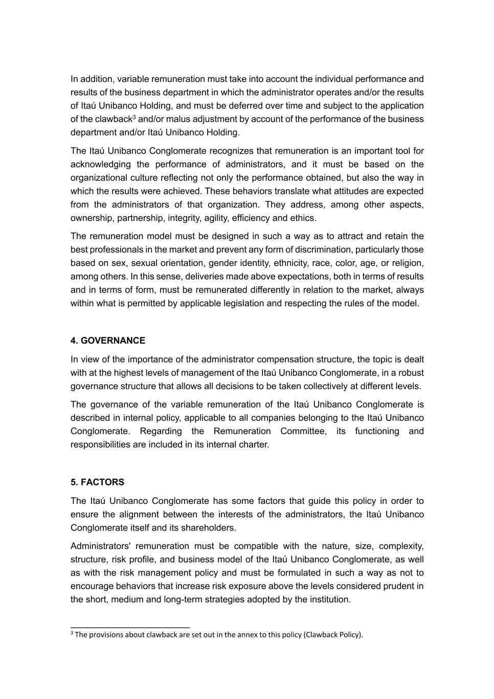 In addition, variable remuneration must take into account the individual performance and results of the business department in which the administrator operates and/or the results of Itaú Unibanco Holding, and must be deferred over time and subject to the application of the clawback3 and/or malus adjustment by account of the performance of the business department and/or Itaú Unibanco Holding. The Itaú Unibanco Conglomerate recognizes that remuneration is an important tool for acknowledging the performance of administrators, and it must be based on the organizational culture reflecting not only the performance obtained, but also the way in which the results were achieved. These behaviors translate what attitudes are expected from the administrators of that organization. They address, among other aspects, ownership, partnership, integrity, agility, efficiency and ethics. The remuneration model must be designed in such a way as to attract and retain the best professionals in the market and prevent any form of discrimination, particularly those based on sex, sexual orientation, gender identity, ethnicity, race, color, age, or religion, among others. In this sense, deliveries made above expectations, both in terms of results and in terms of form, must be remunerated differently in relation to the market, always within what is permitted by applicable legislation and respecting the rules of the model. 4. GOVERNANCE In view of the importance of the administrator compensation structure, the topic is dealt with at the highest levels of management of the Itaú Unibanco Conglomerate, in a robust governance structure that allows all decisions to be taken collectively at different levels. The governance of the variable remuneration of the Itaú Unibanco Conglomerate is described in internal policy, applicable to all companies belonging to the Itaú Unibanco Conglomerate. Regarding the Remuneration Committee, its functioning and responsibilities are included in its internal charter. 5. FACTORS The Itaú Unibanco Conglomerate has some factors that guide this policy in order to ensure the alignment between the interests of the administrators, the Itaú Unibanco Conglomerate itself and its shareholders. Administrators' remuneration must be compatible with the nature, size, complexity, structure, risk profile, and business model of the Itaú Unibanco Conglomerate, as well as with the risk management policy and must be formulated in such a way as not to encourage behaviors that increase risk exposure above the levels considered prudent in the short, medium and long-term strategies adopted by the institution. 3 The provisions about clawback are set out in the annex to this policy (Clawback Policy).