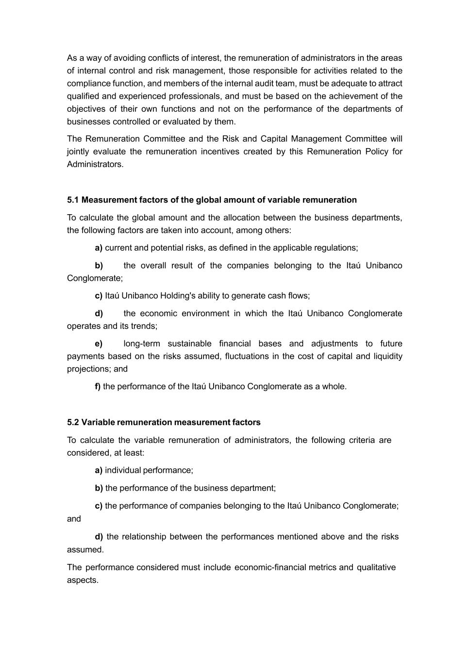 As a way of avoiding conflicts of interest, the remuneration of administrators in the areas of internal control and risk management, those responsible for activities related to the compliance function, and members of the internal audit team, must be adequate to attract qualified and experienced professionals, and must be based on the achievement of the objectives of their own functions and not on the performance of the departments of businesses controlled or evaluated by them. The Remuneration Committee and the Risk and Capital Management Committee will jointly evaluate the remuneration incentives created by this Remuneration Policy for Administrators. 5.1 Measurement factors of the global amount of variable remuneration To calculate the global amount and the allocation between the business departments, the following factors are taken into account, among others: a) current and potential risks, as defined in the applicable regulations; b) the overall result of the companies belonging to the Itaú Unibanco Conglomerate; c) Itaú Unibanco Holding's ability to generate cash flows; d) the economic environment in which the Itaú Unibanco Conglomerate operates and its trends; e) long-term sustainable financial bases and adjustments to future payments based on the risks assumed, fluctuations in the cost of capital and liquidity projections; and f) the performance of the Itaú Unibanco Conglomerate as a whole. 5.2 Variable remuneration measurement factors To calculate the variable remuneration of administrators, the following criteria are considered, at least: a) individual performance; b) the performance of the business department; c) the performance of companies belonging to the Itaú Unibanco Conglomerate; and d) the relationship between the performances mentioned above and the risks assumed. The performance considered must include economic-financial metrics and qualitative aspects.