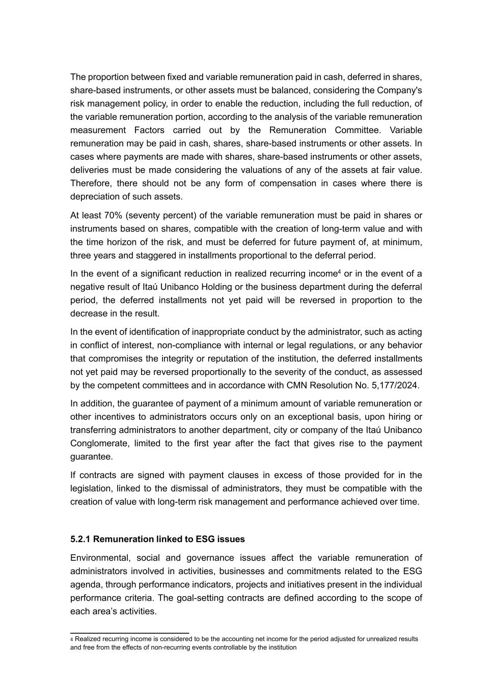 The proportion between fixed and variable remuneration paid in cash, deferred in shares, share-based instruments, or other assets must be balanced, considering the Company's risk management policy, in order to enable the reduction, including the full reduction, of the variable remuneration portion, according to the analysis of the variable remuneration measurement Factors carried out by the Remuneration Committee. Variable remuneration may be paid in cash, shares, share-based instruments or other assets. In cases where payments are made with shares, share-based instruments or other assets, deliveries must be made considering the valuations of any of the assets at fair value. Therefore, there should not be any form of compensation in cases where there is depreciation of such assets. At least 70% (seventy percent) of the variable remuneration must be paid in shares or instruments based on shares, compatible with the creation of long-term value and with the time horizon of the risk, and must be deferred for future payment of, at minimum, three years and staggered in installments proportional to the deferral period. In the event of a significant reduction in realized recurring income4 or in the event of a negative result of Itaú Unibanco Holding or the business department during the deferral period, the deferred installments not yet paid will be reversed in proportion to the decrease in the result. In the event of identification of inappropriate conduct by the administrator, such as acting in conflict of interest, non-compliance with internal or legal regulations, or any behavior that compromises the integrity or reputation of the institution, the deferred installments not yet paid may be reversed proportionally to the severity of the conduct, as assessed by the competent committees and in accordance with CMN Resolution No. 5,177/2024. In addition, the guarantee of payment of a minimum amount of variable remuneration or other incentives to administrators occurs only on an exceptional basis, upon hiring or transferring administrators to another department, city or company of the Itaú Unibanco Conglomerate, limited to the first year after the fact that gives rise to the payment guarantee. If contracts are signed with payment clauses in excess of those provided for in the legislation, linked to the dismissal of administrators, they must be compatible with the creation of value with long-term risk management and performance achieved over time. 5.2.1 Remuneration linked to ESG issues Environmental, social and governance issues affect the variable remuneration of administrators involved in activities, businesses and commitments related to the ESG agenda, through performance indicators, projects and initiatives present in the individual performance criteria. The goal-setting contracts are defined according to the scope of each area’s activities. 4 Realized recurring income is considered to be the accounting net income for the period adjusted for unrealized results and free from the effects of non-recurring events controllable by the institution