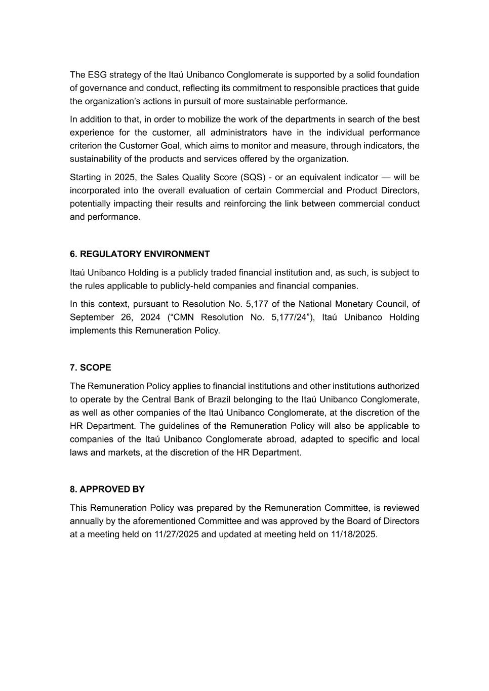 The ESG strategy of the Itaú Unibanco Conglomerate is supported by a solid foundation of governance and conduct, reflecting its commitment to responsible practices that guide the organization’s actions in pursuit of more sustainable performance. In addition to that, in order to mobilize the work of the departments in search of the best experience for the customer, all administrators have in the individual performance criterion the Customer Goal, which aims to monitor and measure, through indicators, the sustainability of the products and services offered by the organization. Starting in 2025, the Sales Quality Score (SQS) - or an equivalent indicator — will be incorporated into the overall evaluation of certain Commercial and Product Directors, potentially impacting their results and reinforcing the link between commercial conduct and performance. 6. REGULATORY ENVIRONMENT Itaú Unibanco Holding is a publicly traded financial institution and, as such, is subject to the rules applicable to publicly-held companies and financial companies. In this context, pursuant to Resolution No. 5,177 of the National Monetary Council, of September 26, 2024 (“CMN Resolution No. 5,177/24”), Itaú Unibanco Holding implements this Remuneration Policy. 7. SCOPE The Remuneration Policy applies to financial institutions and other institutions authorized to operate by the Central Bank of Brazil belonging to the Itaú Unibanco Conglomerate, as well as other companies of the Itaú Unibanco Conglomerate, at the discretion of the HR Department. The guidelines of the Remuneration Policy will also be applicable to companies of the Itaú Unibanco Conglomerate abroad, adapted to specific and local laws and markets, at the discretion of the HR Department. 8. APPROVED BY This Remuneration Policy was prepared by the Remuneration Committee, is reviewed annually by the aforementioned Committee and was approved by the Board of Directors at a meeting held on 11/27/2025 and updated at meeting held on 11/18/2025.